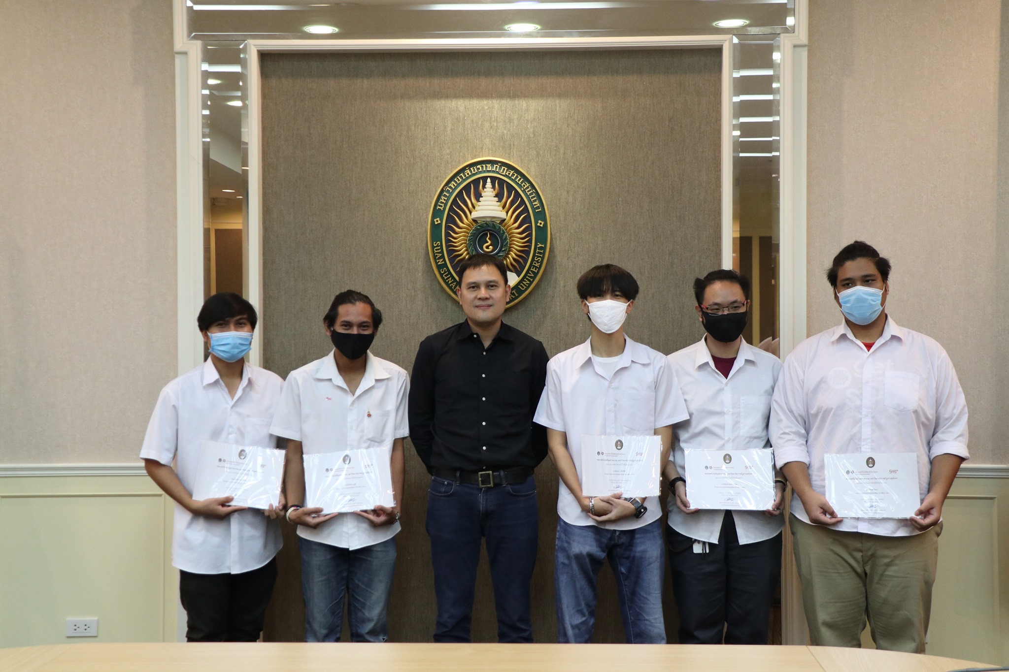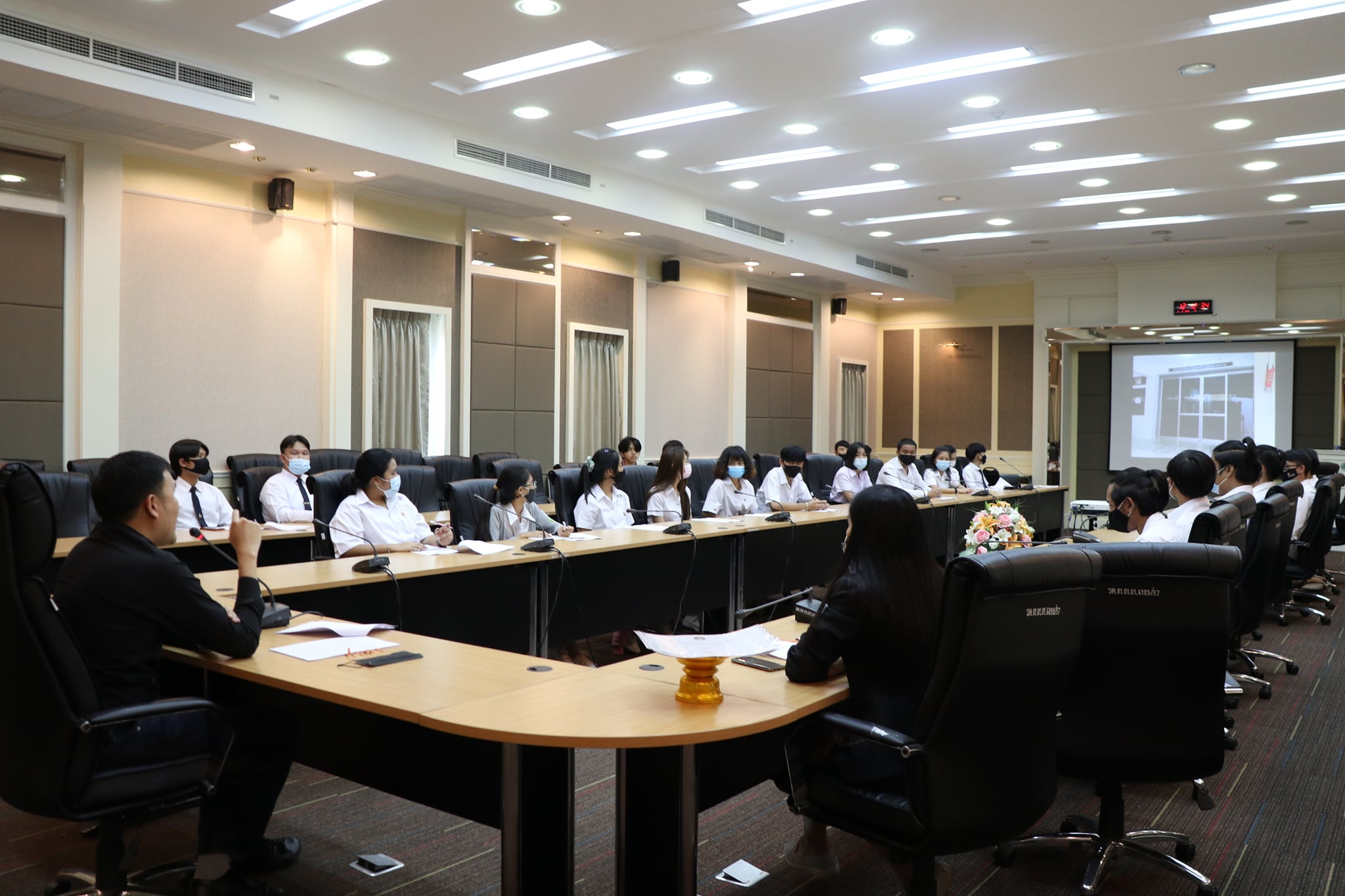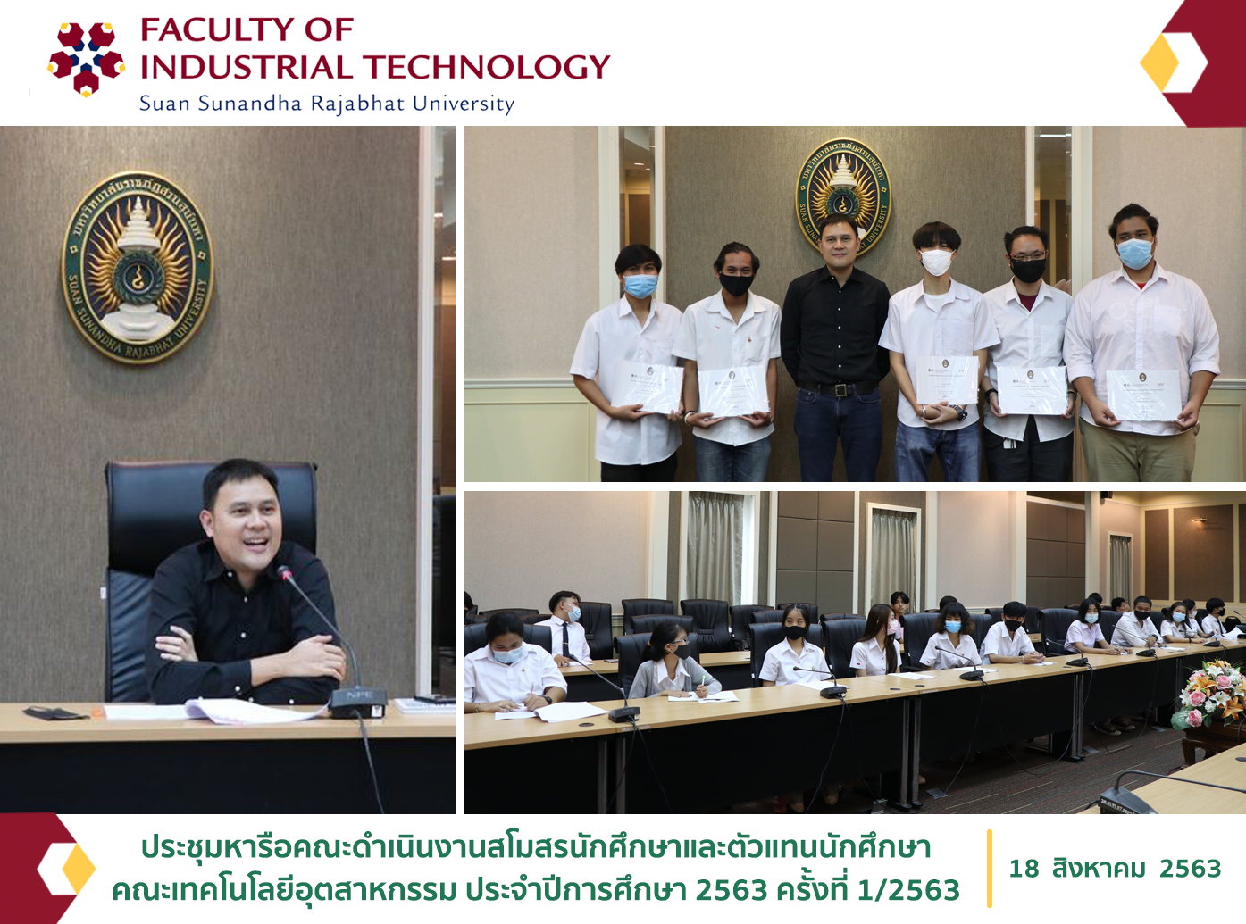 On August 18, 2020, at 12.00 p.m., the Faculty of Industrial Technology led by Mr. Sahapop Gleblumjeak, the Vice Dean for Student Affairs, organized the meeting of staffs of Student Union and representatives of students from the Faculty of Industrial Technology of the academic year 2020 (1/2020) at Pissamai Phimonsat Meeting Room to prepare for organizing student activities, follow up the past activities, and discuss about encountered problems and obstacles in order to be a guideline for improve organizing activities next time.