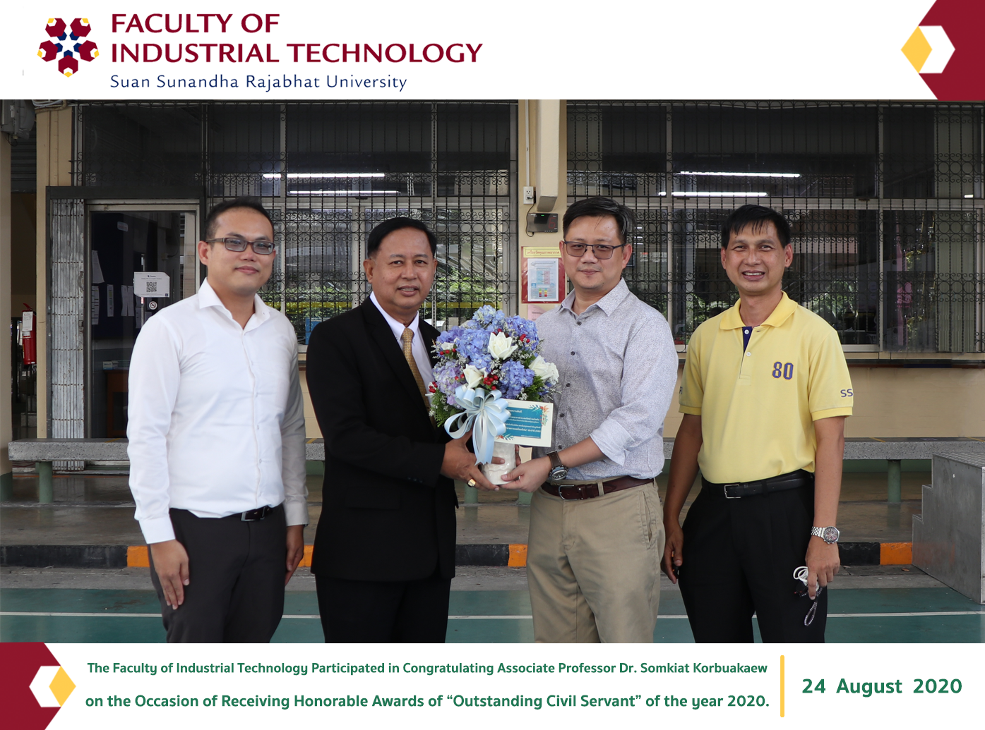 On August 24, 2020, the Faculty of Industrial Technology led by Assistant Professor Dr. Palang Wongtanasuporn, the Dean of the Faculty of Industrial Technology, as well as Dr. Chonmapat Torasa, the Vice Dean for Academic Affairs, and Assistant Professor Dr. Pornpawit Boonsrimuang, the Vice Dean for Planning and Quality Assurance, participated in congratulating Associate Professor Dr. Somkiat Korbuakaew on the occasion of receiving honorable gold garuda needle and certificate of “Outstanding Civil Servant” of the year 2020.