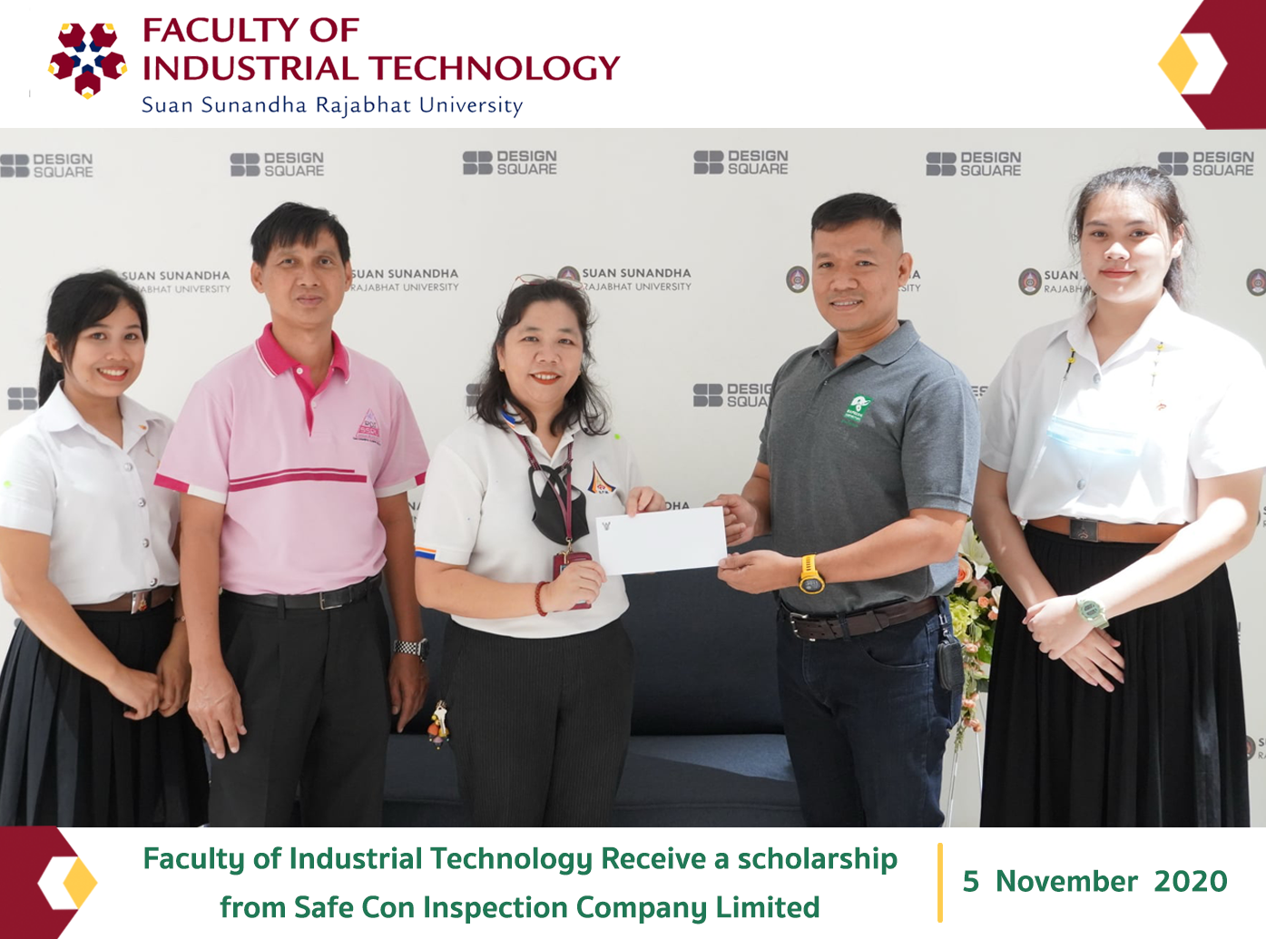 Faculty of Industrial Technology by Assistant Professor Dr. Chanamphat Torasa, Associate Dean for Academic Affairs And Assistant Professor Chitrawadee Rung Inkanka, Head of Building Resource Management Receive a scholarship from Safe Con Inspection Company Limited by Mr. Songkran Henchen Thong, Managing Director A scholarship is awarded for 1 scholarship, 5,000 baht per scholarship, to help students who are good at studying but lacking funds in the Portfolio application round for the academic year 2021.