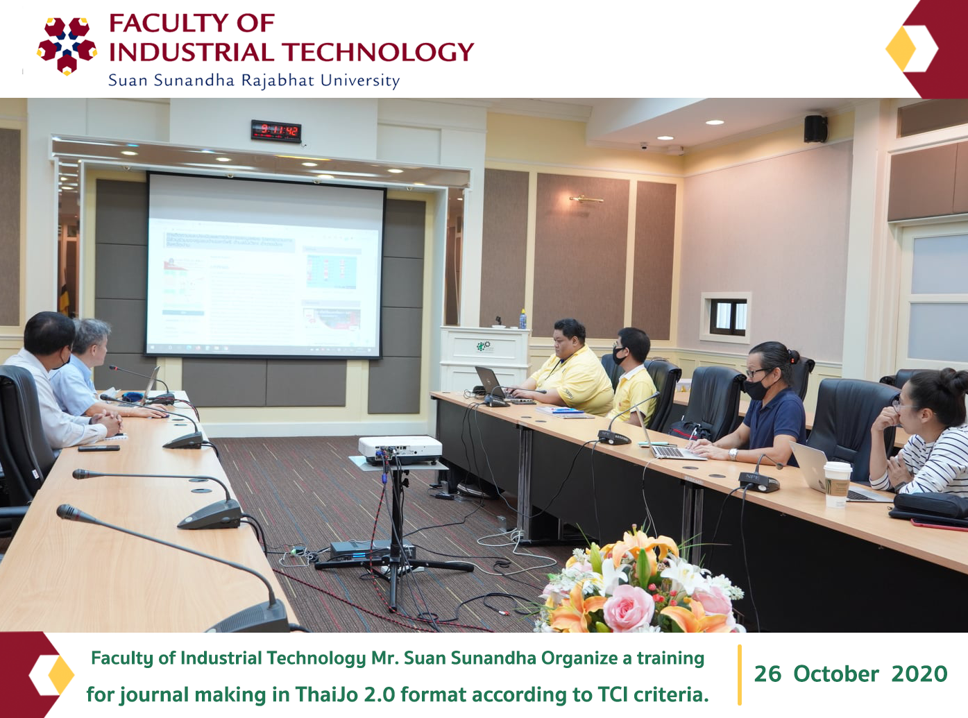 On October 26, 2020 from 9:00 AM to 4:00 PM, the Faculty of Industrial Technology Training in the preparation of journals in the ThaiJo 2.0 format in accordance with the criteria of the Thai Journal Reference Index Center (TCI) at the Pisamai Phimolsat meeting room, 5th floor, Building 43, Suan Sunandha Rajabhat University. With an honor from Ms. Chatree Wongkaew, Educational and Learning Advisor, Royal College Chulabhorn ThaiJo 2.0 journal system expert as a lecturer The objective is to allow participants to use the journal system efficiently. And to develop journal quality to be more recognized