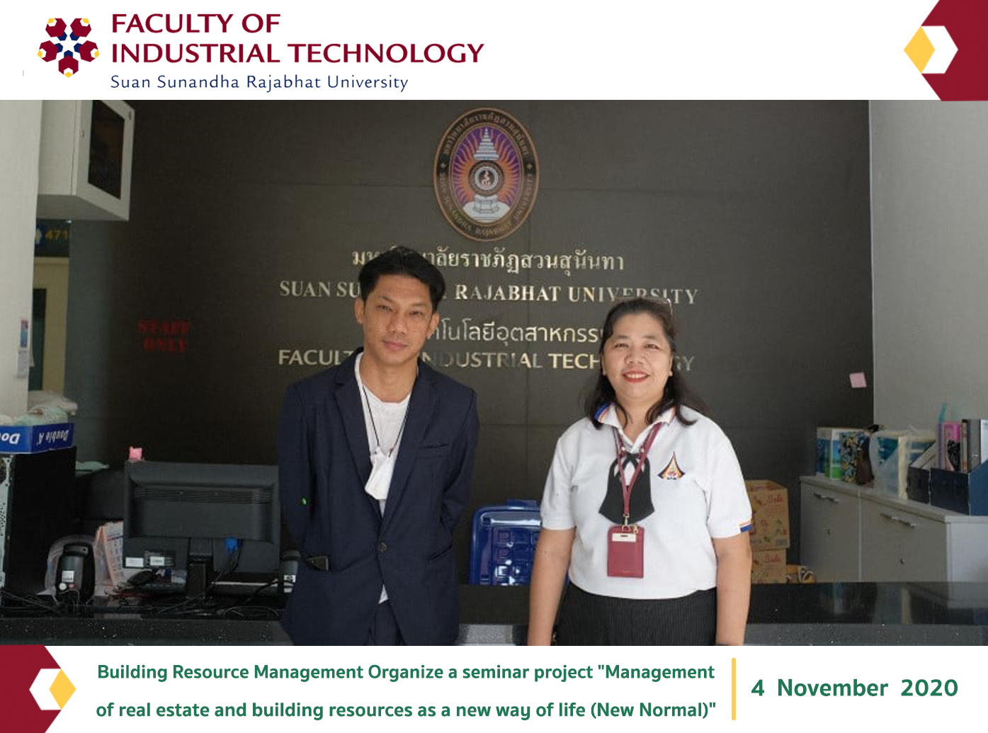 Wednesday, November 4, 2020, 4th year students in Building Resource Management Faculty of Industrial Technology Organize a seminar project "Property Management and Building Resources as a New Way of Life (New Normal)", which is a professional seminar on building resources management. It is a simulated project for the 4th year students in the subject BFM 4521 professional seminar in building resource management. The event was organized by Assistant Professor Chitrawadee Rung Inkanka, Head of Building Resource Management. Presided over the opening ceremony of the seminar project at Meeting Room 4711, Building 47, Faculty of Industrial Technology For students in the first year to the fourth year and faculty. Building Resource Management In order for students to gain knowledge and practice skills in real estate and building resources management as a new way of life (New Normal), he was honored by lecturer building manager from Singha Complex, a subsidiary of Singha Estate. Public Company Limited