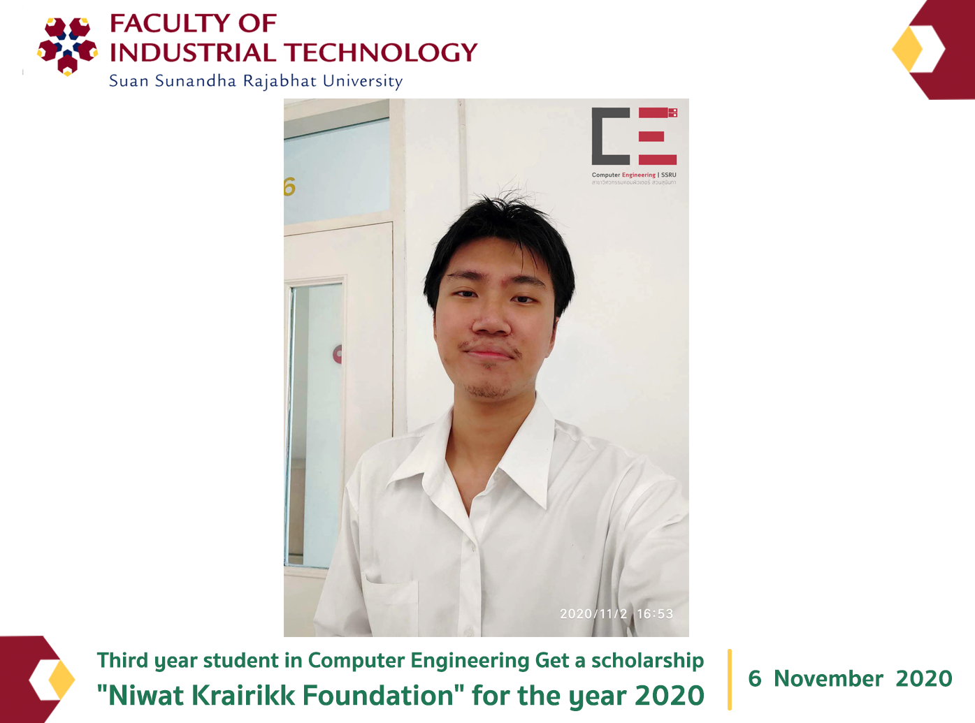 Congratulations to Mr. Pongporn Chareonburanopas Third year student in Computer Engineering Get a scholarship "Niwat Krairikk Foundation" for the year 2020, which is a free grant, no obligation This is a continuous scholarship for the last 2 years of the course. From the academic year 2020-2021, a scholarship is 20,000 baht.