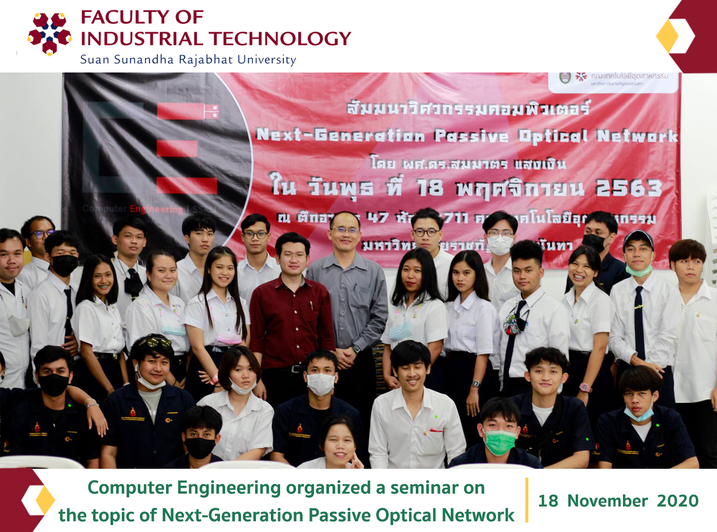 November 18, 2020, Computer Engineering organized a seminar project for computer engineers 2020 on the topic of Next-Generation Passive Optical Network, lectured by Asst. Prof. Dr. Somsaengnoen, honored by Asst. Prof. Apisit Ratanatranurak former deputy director of research and development for learning management innovation presided over the opening speech of the project at room 4711, Faculty of Industrial Technology Suan Sunandha Rajabhat University