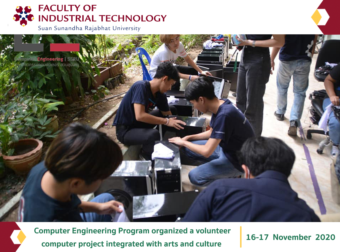 16-17 November 2020 Computer Engineering Program organized a volunteer computer project integrated with arts and culture. With Prof. Kwanruangramee as the project leader, Dr. Sethakan Prongnuch, Head of computer engineering and staff of the Faculty of Industrial Technology along with the students in the 1-4 years of computer engineering, 80 people join in activities such as computer repair. Install the program Design and set up a network, paint and cleaning at Ban Tako Lang school Ratchaburi