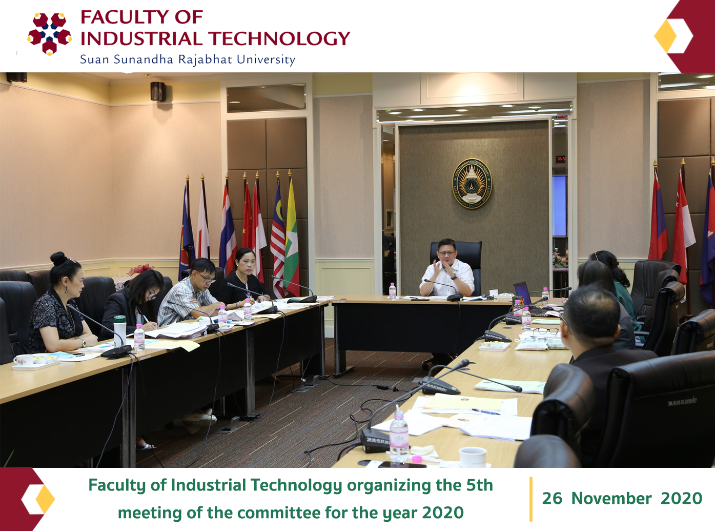 On Thursday, November 26, 2020 at 9:30 a.m. at the meeting room. Faculty of Industrial Technology organized the meeting of the Committee of the Faculty of Industrial Technology No. 5/2020 by Dean of the Faculty of Industrial Technology. Presided over the meeting Along with faculty executives Honorary Director And the Head of the Office of the Dean attended With an important agenda on Approval of student grades For the semester 1/2020, consideration of the course application and transfer of credits of students Consideration of the Improvement Plan for the Academic Year 2019 of the Faculty of Industrial Technology And the consideration of academic cooperation memorandum between Suan Sunandha Rajabhat University and Major Development Estate Company Limited