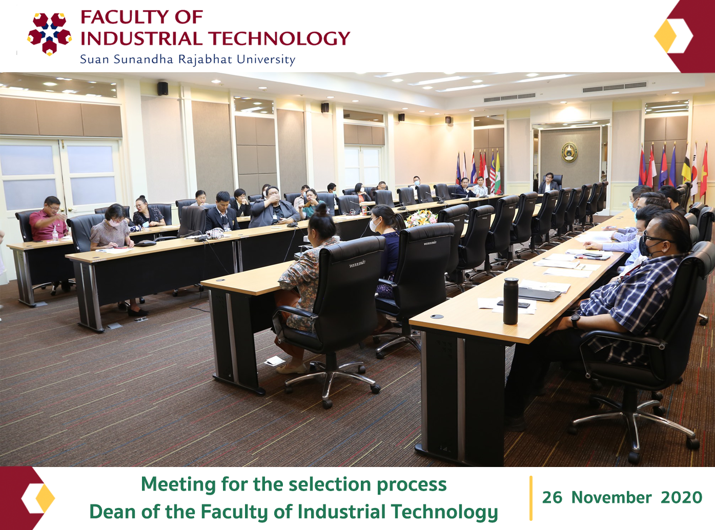 Faculty of Industrial Technology organized a meeting of the academic staff of the university faculty members to proceed with the selection of the recruiting committee for the Dean of the Faculty of Industrial Technology By Asst. Prof. Dr. Palang Wongthanasuporn, Dean of the Faculty of Industrial Technology, assigned Prof. Picha Sriprachan, Deputy Dean for Administration, to chair on November 26, 2020 at the Meeting Room The results of the selection of representatives are as follows Assoc. Prof. Dr. Somkiat Kor Bua Kaew and Asst. Prof. Chitrawadee Runginkanka