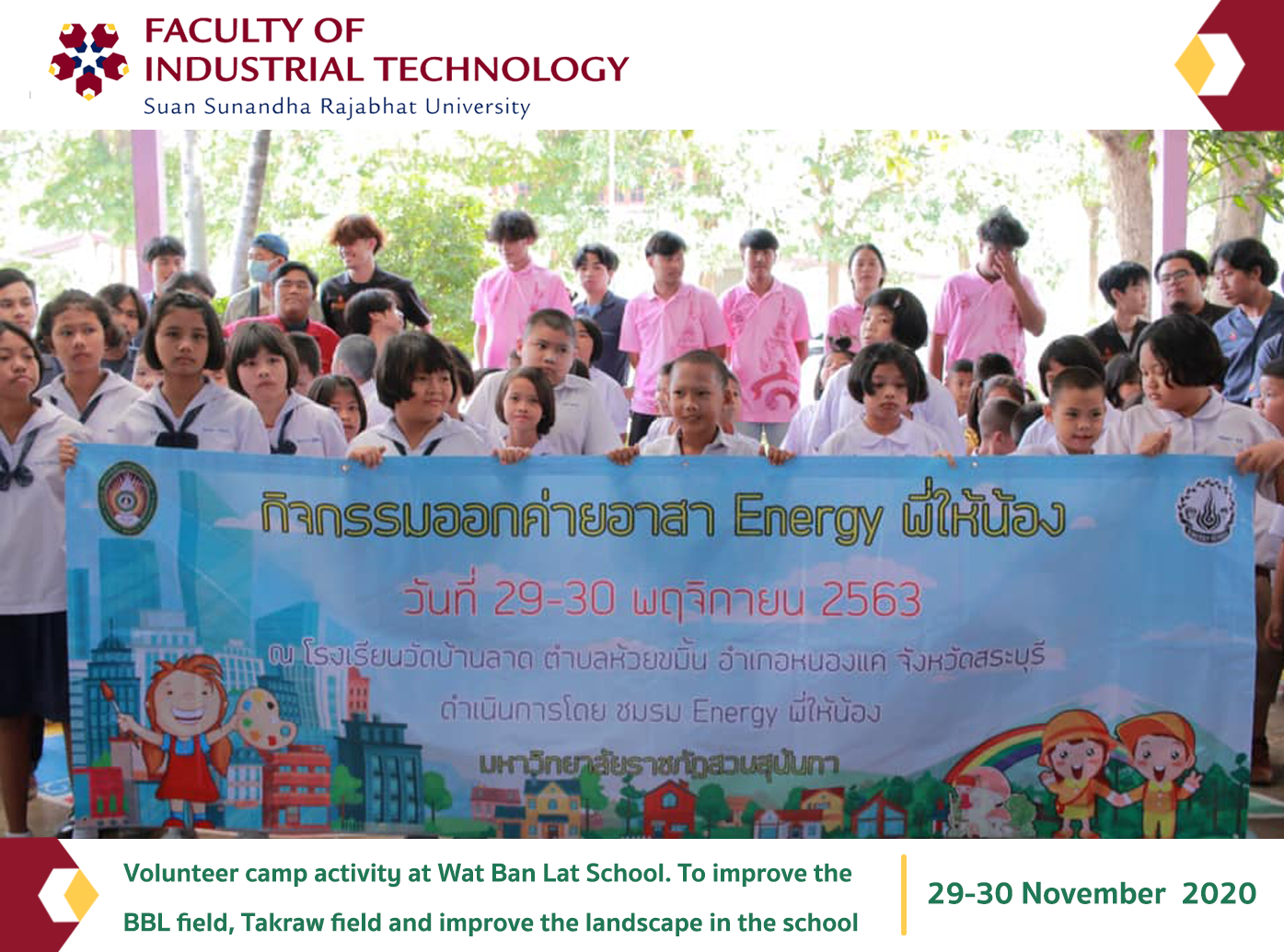 On 29 - 30 November 2020, Wat Ban Lat School, in collaboration with the Energy Brothers Club of the Electrical Technology Department Faculty of Industrial Technology Suan Sunandha Rajabhat University is led by Deputy Dean for Academic Affairs. , Deputy Dean for Academic Affairs, organized a volunteer camp activity at Wat Ban Lat School. To improve the BBL field, Takraw field and improve the landscape in the school