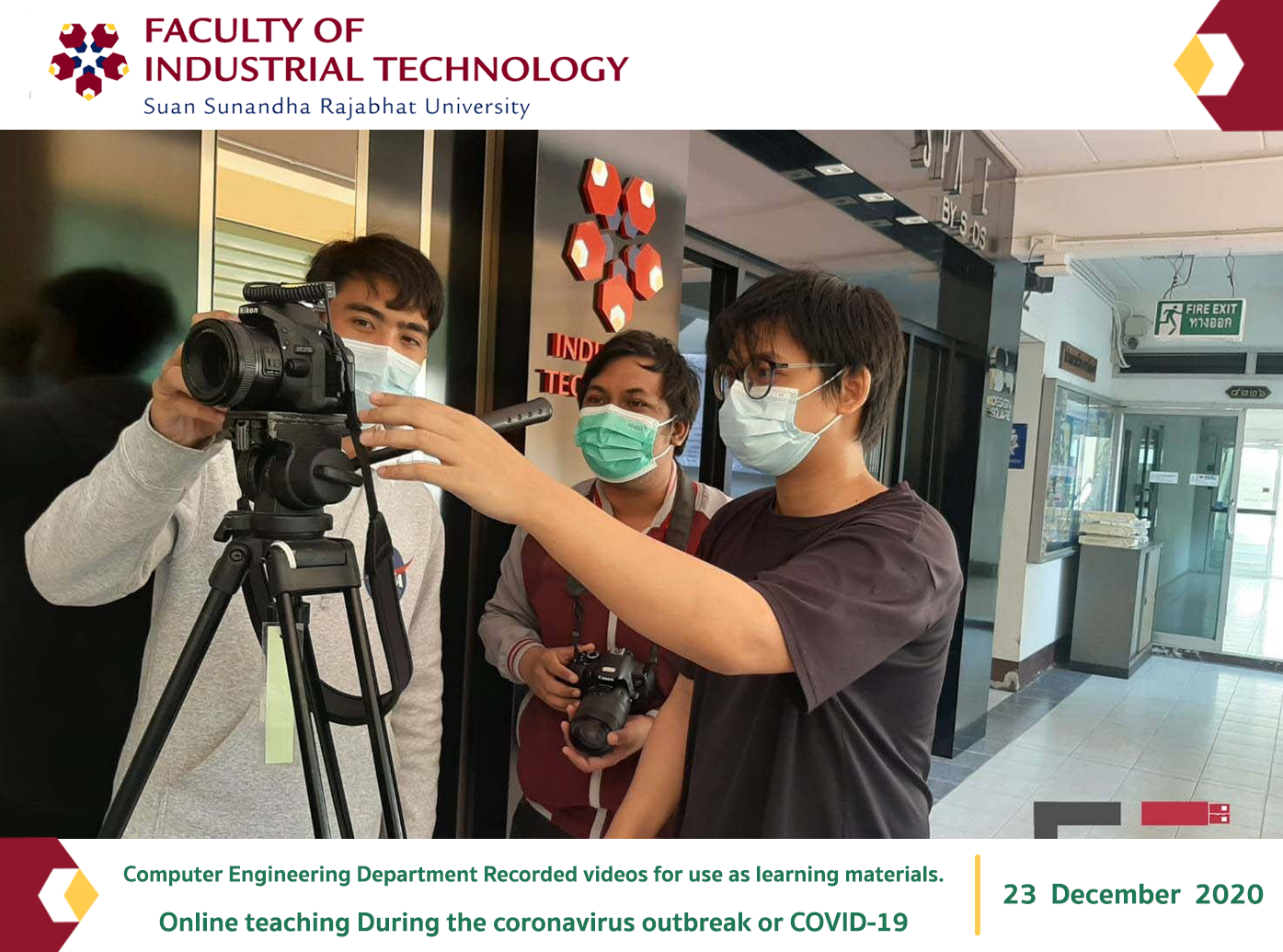 23 December 2020 Asst. Prof. Abhisit Rattanatranurak Lead the student team Computer Engineering Record videos for use as a material for online teaching. During the spread of the coronavirus or COVID-19 of the computer engineering disciplines. Faculty of Industrial Technology Suan Sunandha Rajabhat University