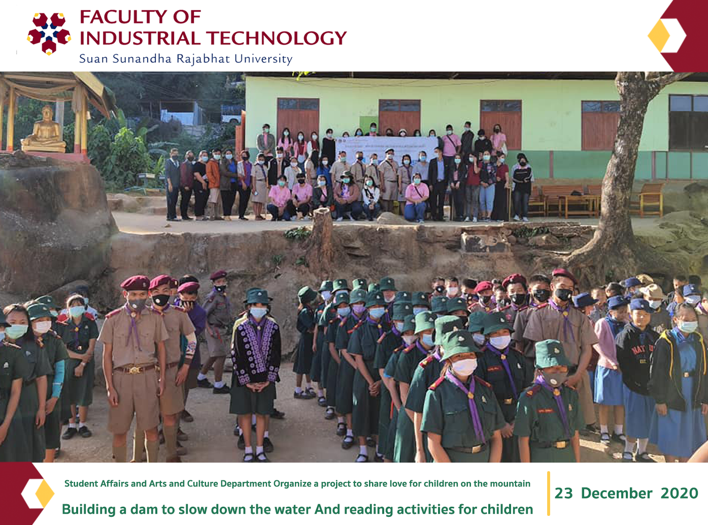 Student Affairs and Arts and Culture Department Organize a project to share love for children on the mountain And reading activities for children on 23-26 December 2020, donating necessary items to the Bon Doi School at Khun Huai Tak Pattana Suksa School Ban Mae Ya Community School And built 17 dams at Bhumibol Dam, Sam Ngao District, Tak Province, with 32 volunteers to participate in this activity. Faithful, Double A (1991) Public Company Limited, Government Pharmaceutical Organization, Lactasoy Company Limited, Boon Rawd Trading Company Limited, supports donated items to schools in the wilderness. In this activity