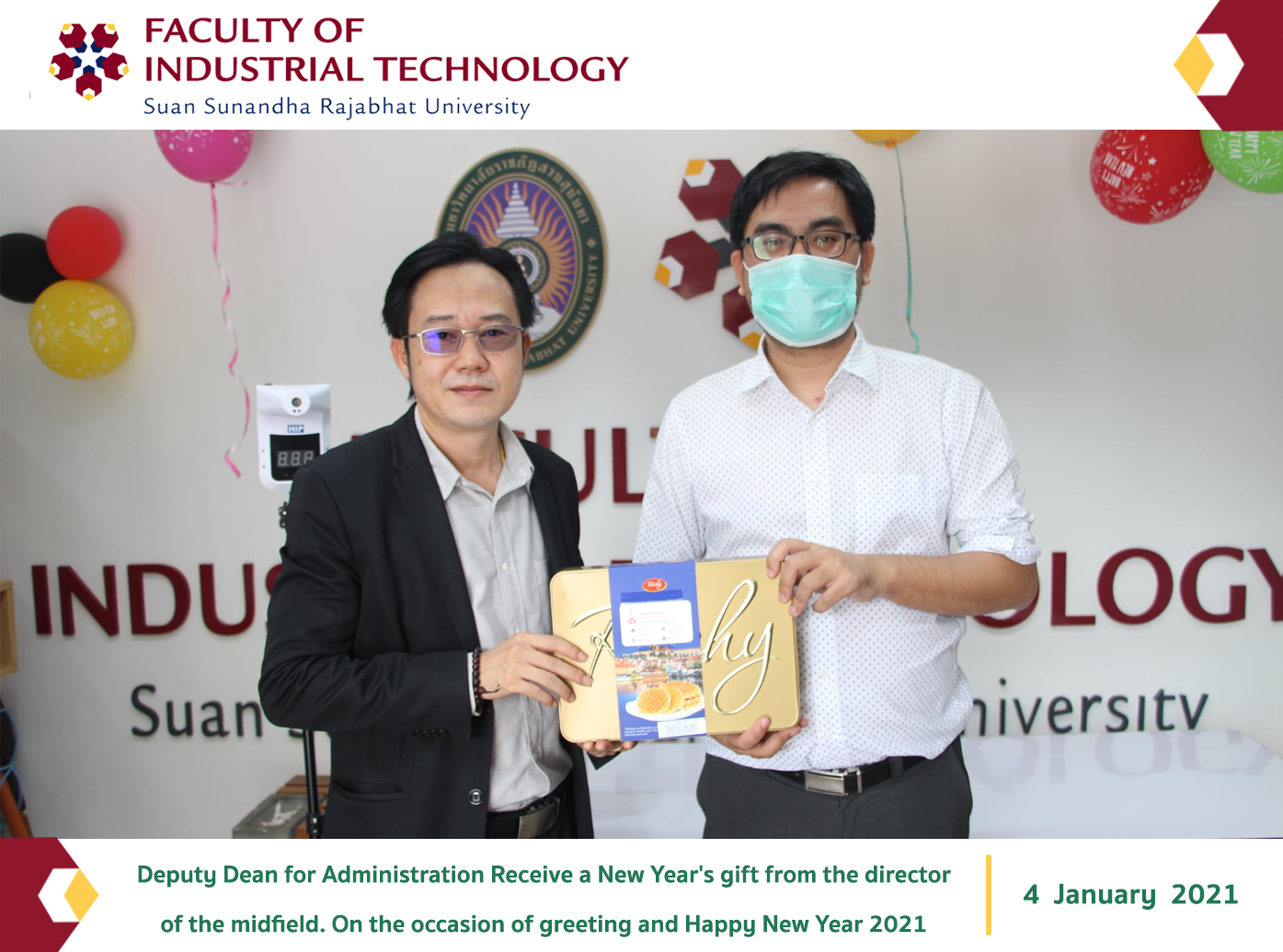 Deputy Dean for Administration Receive a New Year's gift from the director of the midfield. On the occasion of greeting and Happy New Year 2021 at the Office of the Dean, Faculty of Industrial Technology