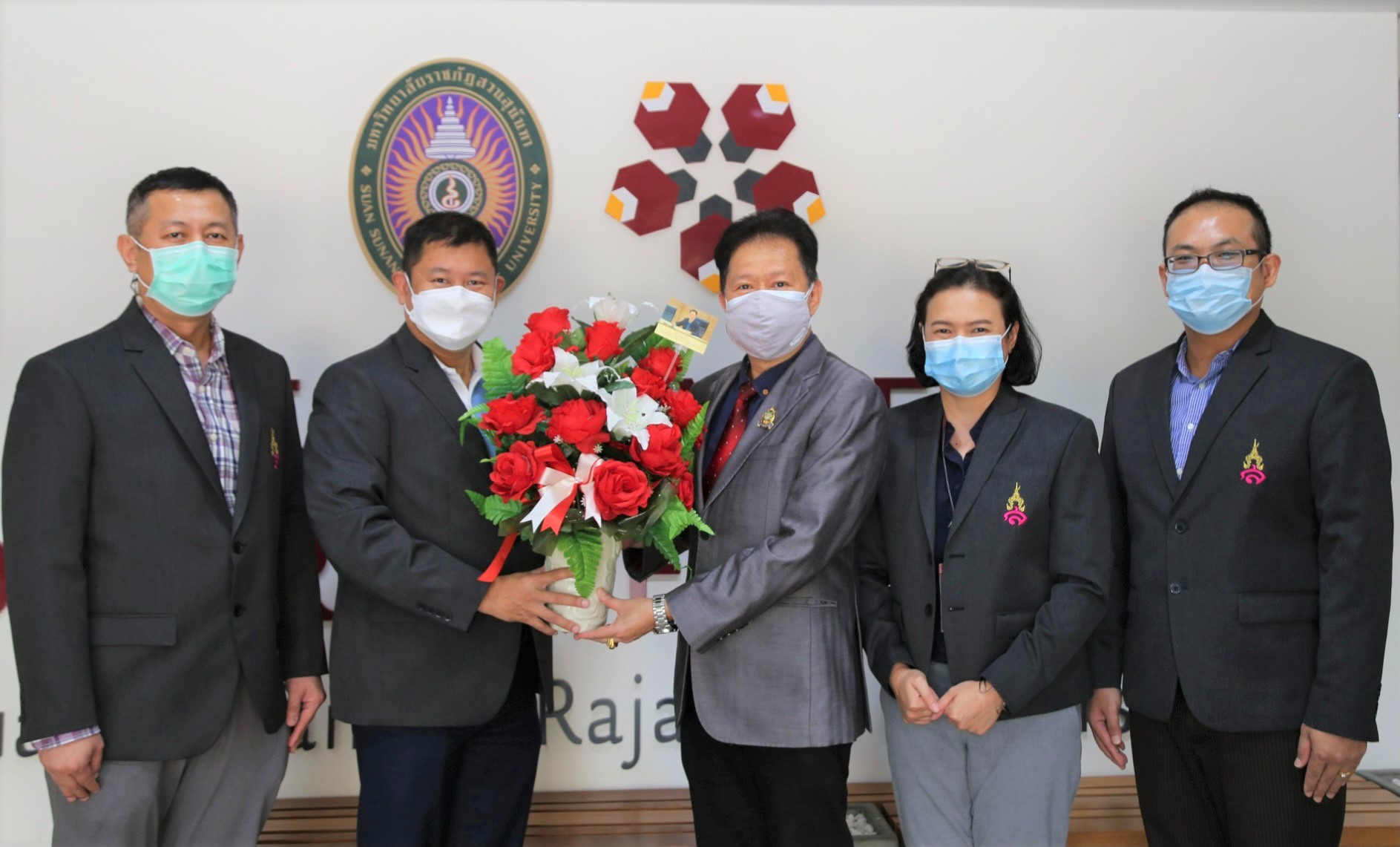 On June 4, 2021, Faculty of Industrial Technology by Assistant Professor Dr. Suraphan Ratanavadi, Dean of the Faculty of Industrial Technology. along with the management team and the faculty members presented a vase of flowers to congratulate Assistant Professor Weera Chotthamaporn Appointed to be the chairman of the Faculty Council and Government officials in the second term according to the Suan Sunandha Rajabhat University Council At the meeting No. 5 / 2021, on May 27, 2021, with Associate Professor Dr. Ruadech Kerdwichai, President of Suan Sunandha Rajabhat University Council chair the meeting