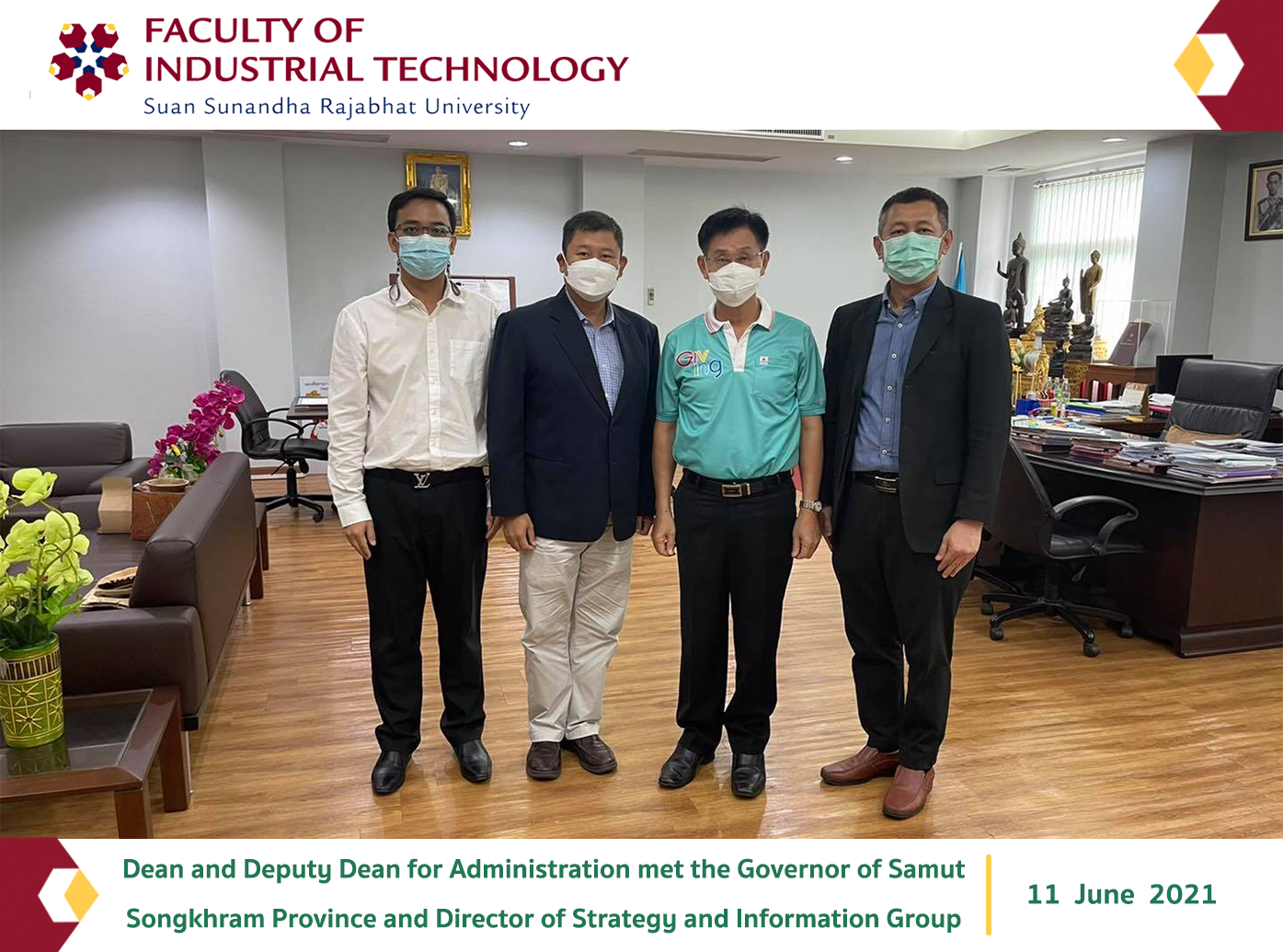 Dean and Associate Dean for Administration, Faculty of Industrial Technology Suan Sunandha Rajabhat University met with the Governor of Samut Songkhram Province and Director of Strategy and Information Group to discuss product and packaging development For the development of the province's products on June 11, 2021 at 1:00 p.m. at the Samut Songkhram Governor's Office, 2nd floor, Samut Songkhram City Hall.