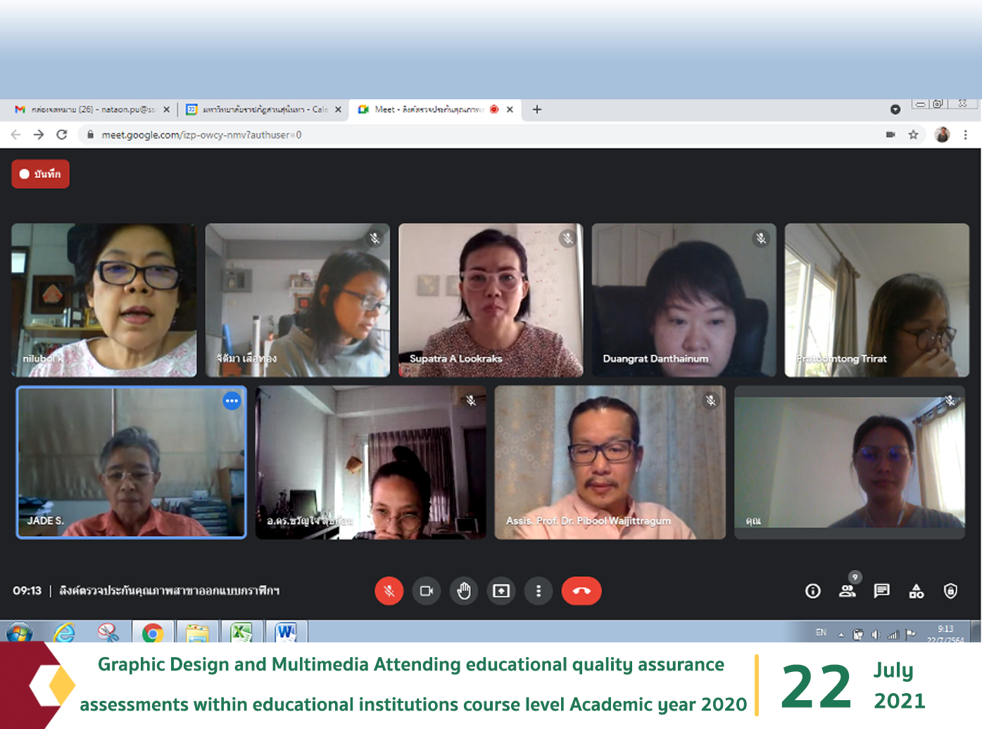 On July 22, 2021, Department of Graphic and Multimedia Design Faculty of Industrial Technology Attending educational quality assurance assessments within educational institutions course level For the academic year 2020, online via Google Meet, with 5 full-time instructors participating in the program from the results of the quality assurance assessment. It was found that the majors received the course scores in the “good” level.