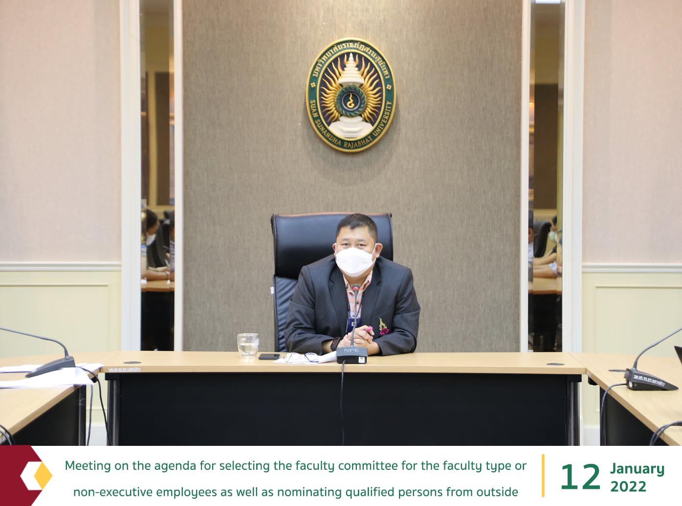 January 12, 2022 Dean of the Faculty of Industrial Technology The chairman of the meeting on the agenda for selecting the committee of the faculty, type of faculty or non-executive employees as well as nominating qualified persons from outside The meeting was attended at Phisamai Phimonsat Meeting Room, Building 43, Faculty of Industrial Technology. Suan Sunandha Rajabhat University 8 persons and 32 attendees via online system (Google meet)