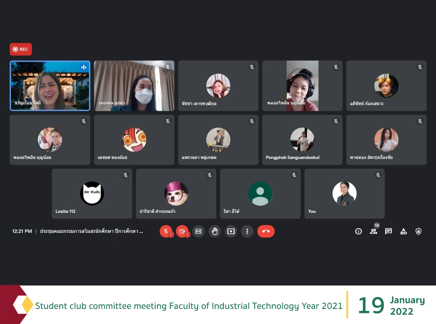 Student club committee meeting Faculty of Industrial Technology Year 2021 on Wednesday 19 January 2022 Deputy Dean for Student Affairs presided over the student club committee meeting Faculty of Industrial Technology to prepare for student development activities and the expiration of the student club's term Faculty of Industrial Technology for the year 2021 prepares for student club elections Academic year 2022 via online system (Google meet)