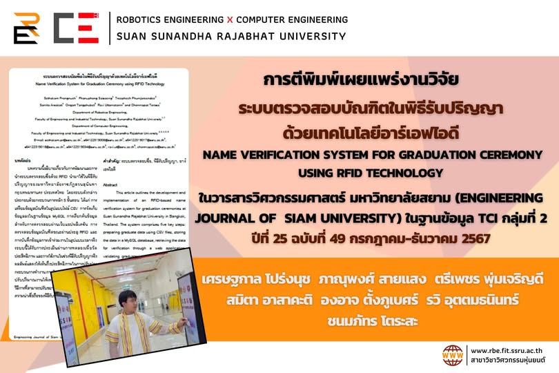 Asst. Prof. Dr. Sethakarn Prongnuch, Asst. Prof. Dr. Chonmapat Torasah, Department of Robotics Engineering, and Asst. Prof. Dr. Ravi Uttamatanin, Department of Computer Engineering, along with Mr. Phanupong Saisang, Mr. Treepetch Phumcharoendee, Ms. Samita Asakati, and Mr. Ong-art Tangphubet, students of the Department of Computer Engineering, Faculty of Engineering and Industrial Technology, Suan Sunandha Rajabhat University, have published a research article titled "Name Verification System for Graduation Ceremony using RFID Technology" in the Engineering Journal of Siam University, Volume 25, Issue 2, No. 49, July-December 2024, which is a journal in the TCI (Thai Journal Citation Index) database, Group 2.