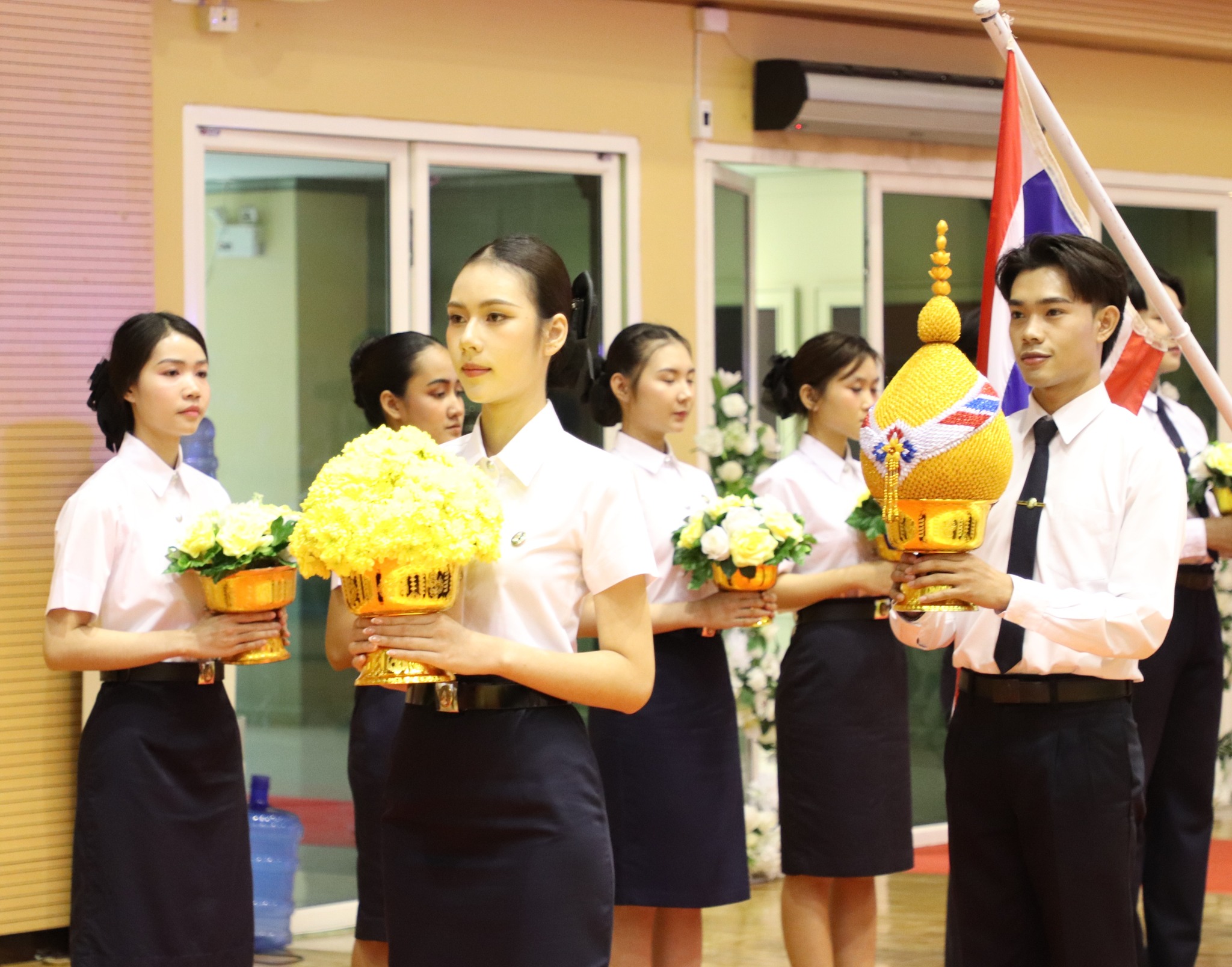- Mr. Kittithat Wisutthisen, 2nd year student, Faculty of Engineering and Industrial Technology, Department of Graphic Design and Multimedia, holding the flower tray