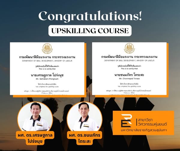 Faculty of Engineering and Industrial Technology would like to congratulate Asst. Prof. Dr. Sethakarn Prongnuch, Head of the Robotics Engineering Program, and Asst. Prof. Dr. Chnmapat Torasa, Lecturer of the Robotics Engineering Program, who successfully completed the Upskilling Course in the Application of Robot Operating System (ROS) with Microcontrollers course, 30 hours, from the Department of Skill Development, Ministry of Labor, during February 15-23, 2025 at the Manufacturing Automation and Robotics Academy.