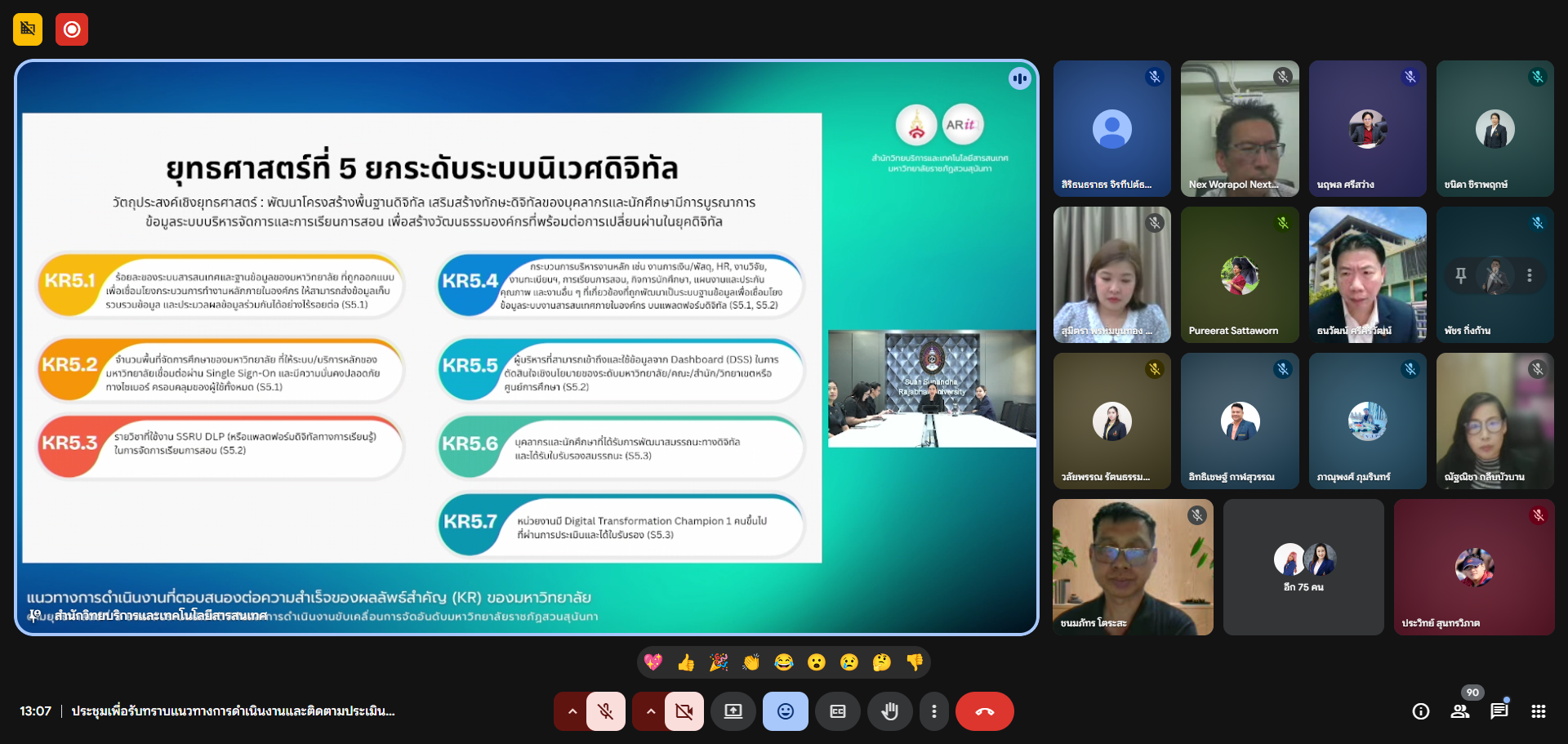 On October 30, 2025, Assistant Professor Dr. Chonmapat Torasa, Dean of the Faculty of Engineering and Industrial Technology, together with the faculty staff, attended a meeting to acknowledge the implementation guidelines for Strategic Goal 5 (KR 5.1–5.7) and the execution plan for the university ranking of Suan Sunandha Rajabhat University for the fiscal year 2026. The meeting was chaired by Associate Professor Dr. Sirilak Ketchaya, Vice President for Digital Technology, and was conducted online via Google Meet.