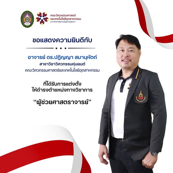 The Faculty of Engineering and Industrial Technology would like to extend its sincere congratulations to Dr. Patinya Samanuhut, a lecturer in the Robotics Engineering Program, Faculty of Engineering and Industrial Technology, on his appointment to the academic rank of Assistant Professor.