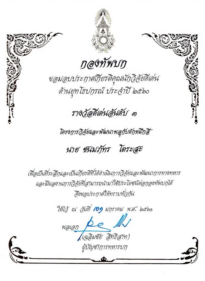 ผู้บริหารฯ เข้ารับโล่รางวัลหน่วยวิจัยดีเด่นอันดับ 3 ของกองทัพบก ด้านยุทโธปกรณ์ ประจำปี 2560