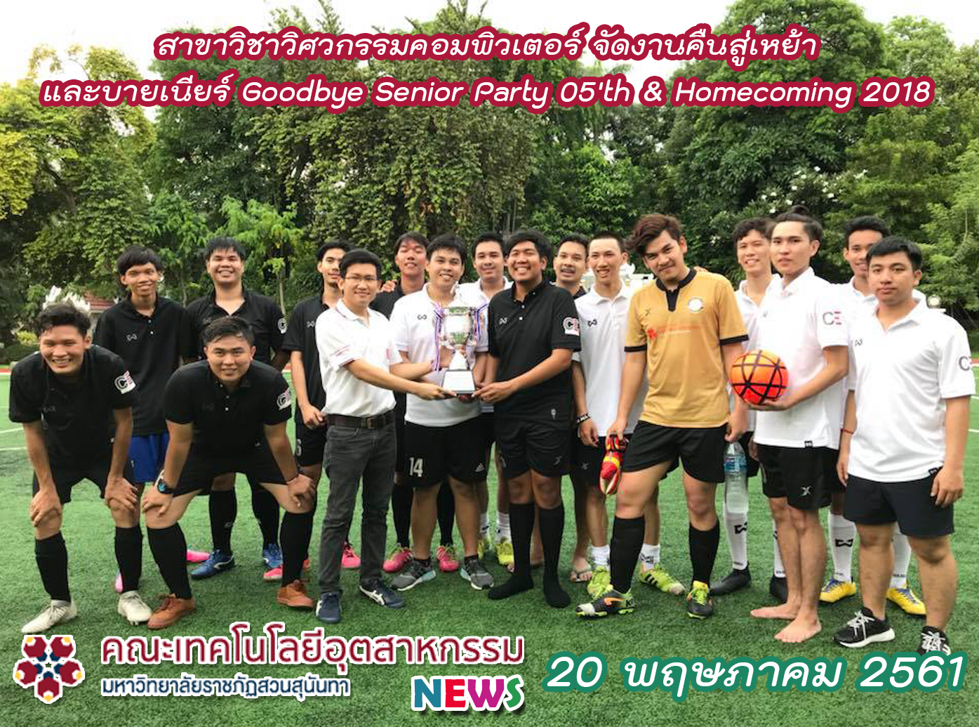 เมื่อวันที่ 20 พ.ค. 61 สาขาวิชาวิศวกรรมคอมพิวเตอร์ ได้จัดงานคืนสู่เหย้า และบายเนียร์ Goodbye Senior Party 05'th & Homecoming 2018 โดยมีกิจกรรม ได้แก่ การแข่งขันฟุตบอลกระชับมิตรระหว่างทีมศิษย์ปัจจุบันกับทีมอาจารย์และศิษย์เก่า รดน้ำขอพรจากอาจารย์ และงานสังสรรค์ร้องเพลง
