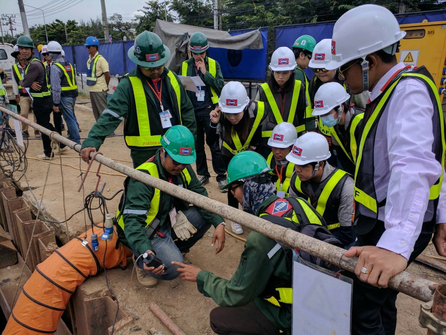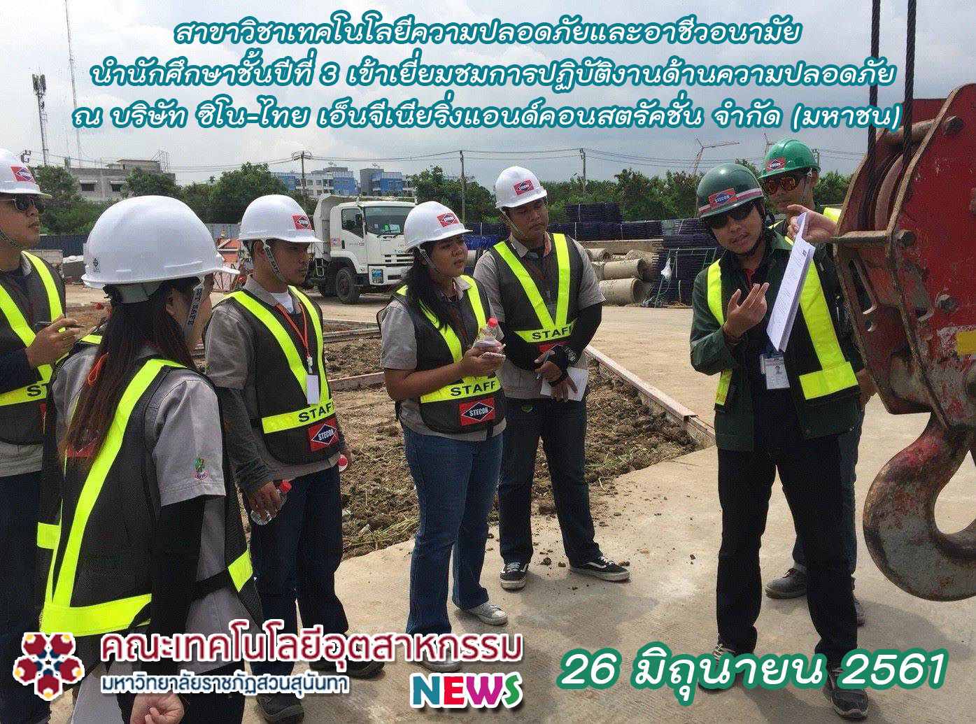 วันที่ 26 มิถุนายน 2561 สาขาวิชาเทคโนโลยีความปลอดภัยและอาชีวอนามัยนำนักศึกษาชั้นปีที่ 3 เข้าเยี่ยมชมการปฏิบัติงานด้านความปลอดภัย ณ บริษัท ซิโน-ไทย เอ็นจีเนียริ่งแอนด์คอนสตรัคชั่น จำกัด (มหาชน) ในโครงการก่อสร้างรถไฟฟ้าสายสีชมพู ช่วง แคราย – มีนบุรี เพื่อให้นักศึกษาได้เรียนรู้กระบวนการทำงานของ จป.วิชาชีพ (สายก่อสร้าง) การตรวจเครน 25 ตัน การจัดการสาธารณูปโภคก่อนการก่อสร้างทางรถไฟฟ้า และได้รู้จักเทคโนโลยีใหม่ๆ ทางด้านงานก่อสร้าง