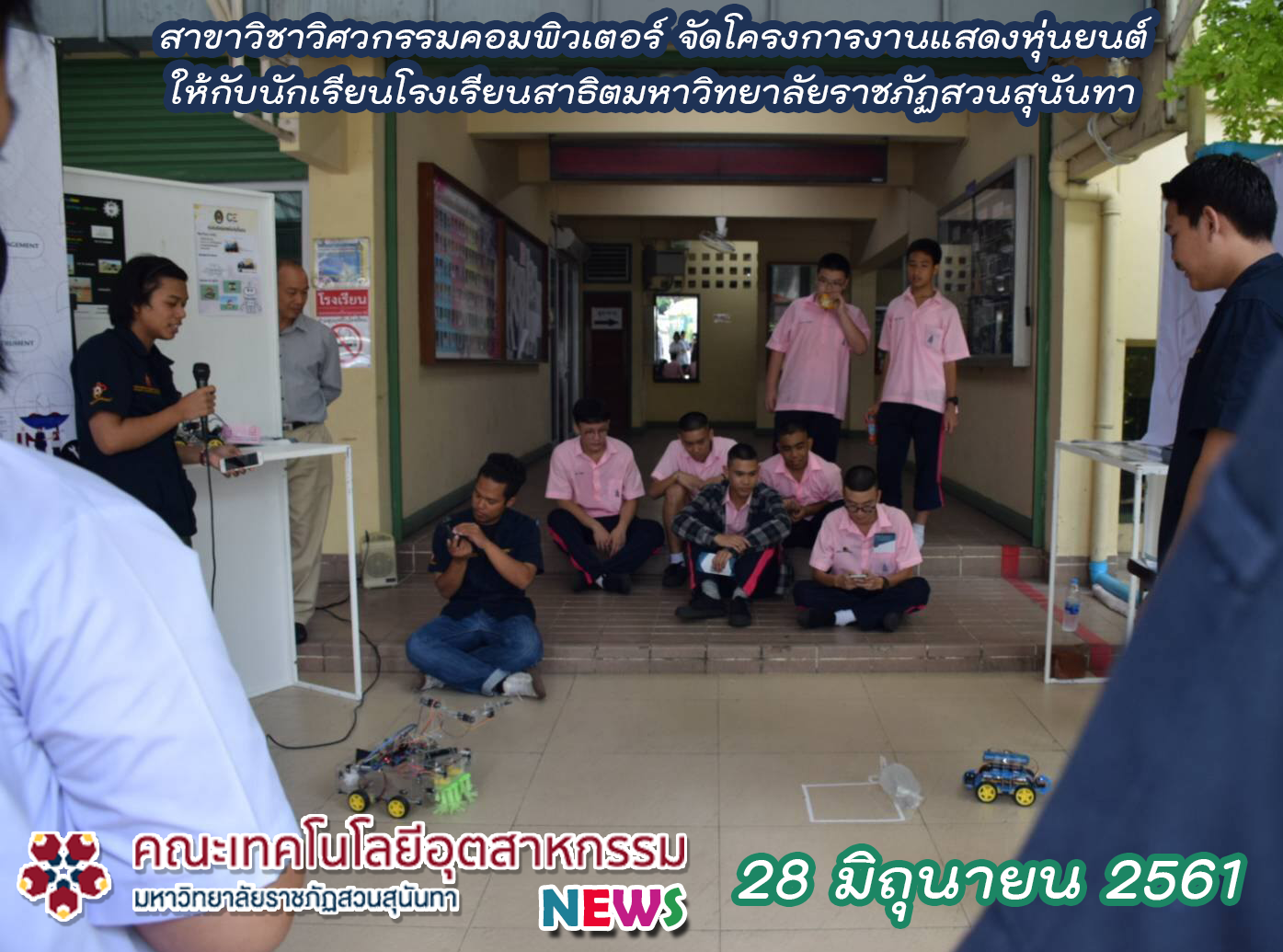เมื่อวันที่ 28 มิถุนายน 2561 อาจารย์เศรษฐกาล โปร่งนุช หัวหน้าสาขาวิชาวิศวกรรมคอมพิวเตอร์ จัดโครงการงานแสดงหุ่นยนต์ ให้กับนักเรียนโรงเรียนสาธิตมหาวิทยาลัยราชภัฏสวนสุนันทา โดย รศ.ดร.สมเกียรติ กอบัวแก้ว ผู้อำนวยการโรงเรียน ให้การต้อนรับและให้การสนับสนุนในการจัดแสดงหุ่นยนต์ โดยมีนักศึกษาสาขาวิชาวิศวกรรมคอมพิวเตอร์ร่วมแสดงการสาธิตการบังคับหุ่นยนต์ผ่านระบบ wifi ในมือถือ ซึ่งได้รับความสนใจจากน้องๆ นักเรียนเป็นจำนวนมาก