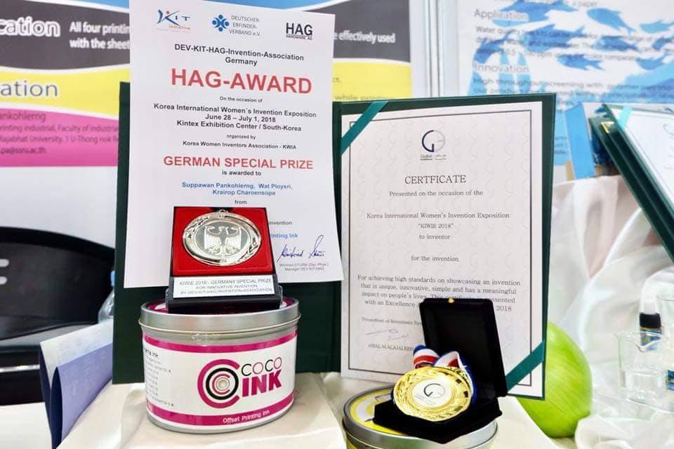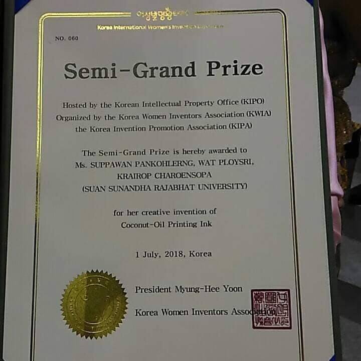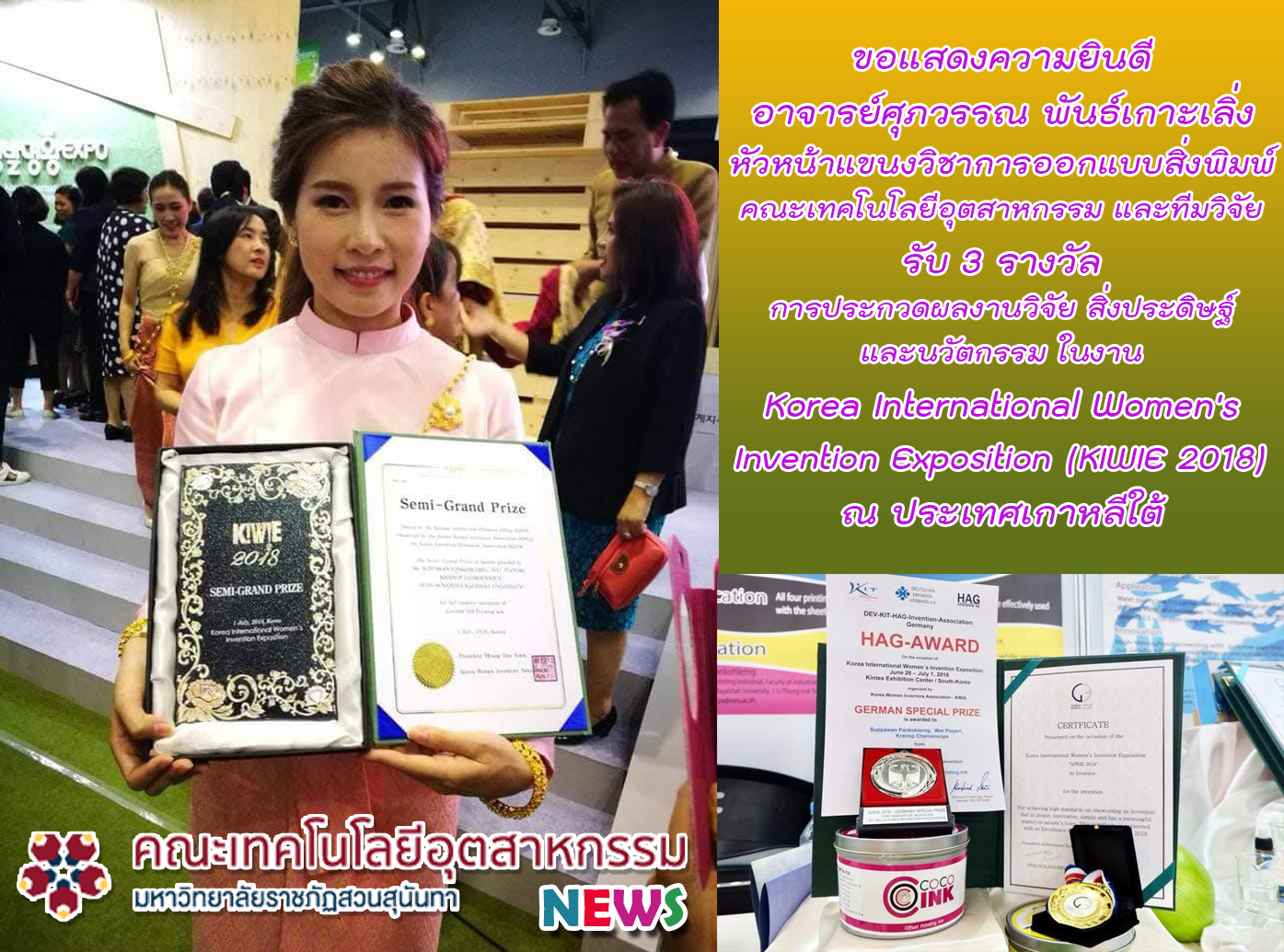 ขอแสดงความยินดี อาจารย์ศุภวรรณ พันธ์เกาะเลิ่ง หัวหน้าแขนงวิชาการออกแบบสิ่งพิมพ์ คณะเทคโนโลยีอุตสาหกรรม และทีมวิจัย ในโอกาสได้รับ 3 รางวัล จากการประกวดผลงานวิจัย สิ่งประดิษฐ์ และนวัตกรรม ในงาน Korea International Women's Invention Exposition (KIWIE 2018) ณ Korea International Exhibition & Convention Center (KINTEX) ประเทศเกาหลีใต้ ระหว่างวันที่ 28 มิถุนายน – วันที่ 1 กรกฎาคม 2561 ซึ่งรางวัลที่ได้รับดังนี้