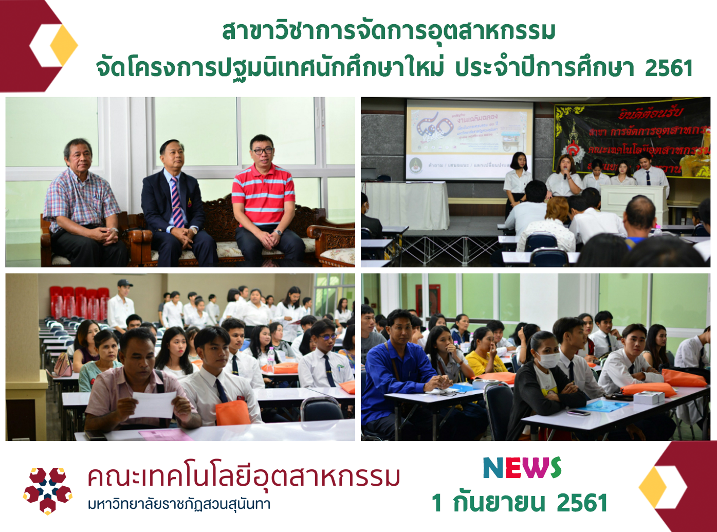 สาขาวิชาการจัดการอุตสาหกรรม ได้จัดโครงการปฐมนิเทศนักศึกษาใหม่ของสาขาวิชา ณ ห้อง 4701 อาคาร 47 คณะเทคโนโลยีอุตสาหกรรม โดยได้เชิญนักศึกษาใหม่พร้อมกับผู้ปกครองเข้าร่วมในกิจกรรมนี้ เพื่อพบกับอาจารย์ประจำสาขาวิชาทำการแนะนำหลักสูตร และพบปะผู้ปกครองเพื่อร่วมมือกับสาขาวิชาในการผลักดันให้นักศึกษาได้ศึกษาจนสำเร็จตามระยะเวลาที่กำหนดของหลักสูตร นอกจากนี้ยังได้เปิดโอกาสให้นักศึกษารุ่นพี่ร่วมพูดคุย ทั้งเรื่องเทคนิคการเรียน กิจกรรม และการใช้ชีวิตในมหาวิทยาลัยให้ประสบความสำเร็จอีกด้วย นักศึกษาใหม่และผู้ปกครองต่างได้รับความรู้ มีทัศนคติที่ดีต่อสาขาวิชา และรู้สึกพึงพอใจต่อการจัดกิจกรรมในระดับดีถึงดีมากอีกด้วย