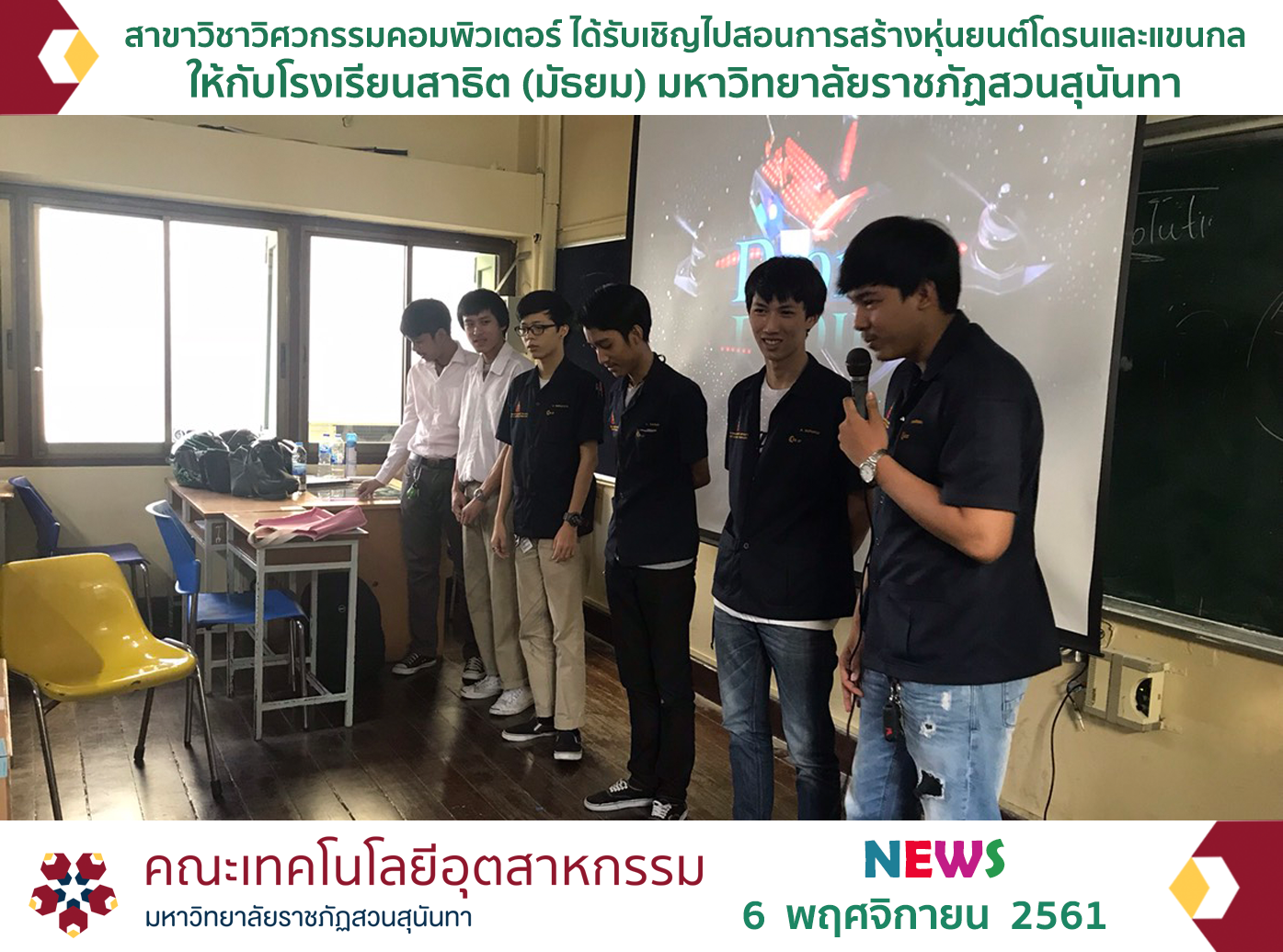 เมื่อวันที่ 6 พ.ย. 2561 ที่ผ่านมา สาขาวิชาวิศวกรรมคอมพิวเตอร์ ได้รับเชิญไปสอนการสร้างหุ่นยนต์โดรนและแขนกล ให้กับโรงเรียนสาธิต (มัธยม) มหาวิทยาลัยราชภัฏสวนสุนันทา โดยมีทีมงานผู้สอนประกอบด้วย อาจารย์เศรษฐกาล โปร่งนุชนายศุภกิจ กิจนะบำรุงศักดิ์นายธีรยุทธิ์ กิจสกุณี นายปรัชญา ขยันเยี่ยม นายศรัณย์ กงมะณี นางสาววีรพร ประทุมทอง นายกรกช สุขศิริศักดิ์ นางสาวปุณฑริกา สายหยุด นายธีรนันท์ สิทธิดำรง นายปิยวัชร วุฒิโช นายณัฐวุฒิ ทองดีเลิศ ซึ่งดำเนินการสอนทุกวันอังคาร รวมทั้งสิ้น 12 สัปดาห์