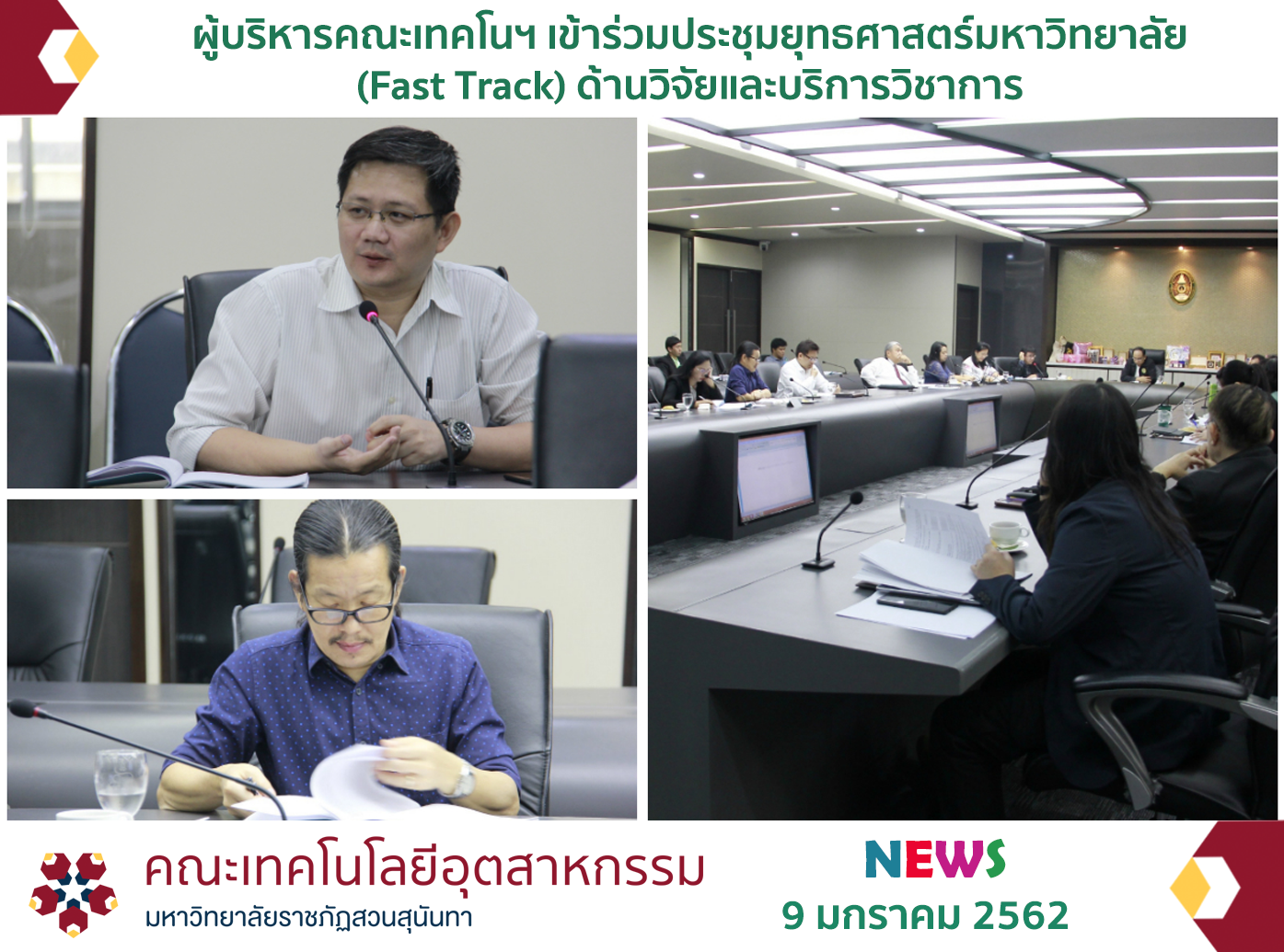เมื่อวันที่ 9 มกราคม 2562 เวลา 09.30 – 12.00 น. ผศ.ดร.พลัง วงษ์ธนสุภรณ์ คณบดีคณะเทคโนโลยีอุตสาหกรรม พร้อมด้วย ผศ.ดร.พิบูล ไวจิตรกรรม รองคณบดีฝ่ายวิจัยและบริการวิชาการ เข้าร่วมประชุมคณะกรรมการดำเนินงานยุทธศาสตร์มหาวิทยาลัย ประจำปีงบประมาณ 2562 (Fast Track) ด้านวิจัยและบริการวิชาการ ครั้งที่ 1/2562 จัดโดยสถาบันวิจัยและพัฒนา โดยมี รศ.ดร.ธนสุวิทย์ ทับหิรัญรักษ์ รองอธิการบดีฝ่ายวิจัยและพัฒนา เป็นประธานในการประชุม ณ ห้องประชุมสภามหาวิทยาลัย