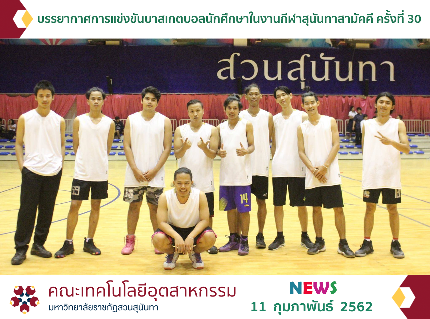 เมื่อวันที่ 11 กุมภาพันธ์ 2562 กองพัฒนานักศึกษา มหาวิทยาลัยราชภัฏสวนสุนันทา จัดให้มีการแข่งขันกีฬาบาสเกตบอลสำหรับนักศึกษา ประเภททีมชาย ณ สนามกีฬาอาคารศูนย์สุขภาพและกีฬาสวนสุนันทา ซึ่งเป็นการแข่งขันระหว่างทีมจากคณะเทคโนโลยีอุตสาหกรรมและทีมจากคณะวิทยาการจัดการ โดยผลการแข่งขันทีมคณะวิทยาการจัดการเป็นฝ่ายชนะไป 43 : 35 คะแนน