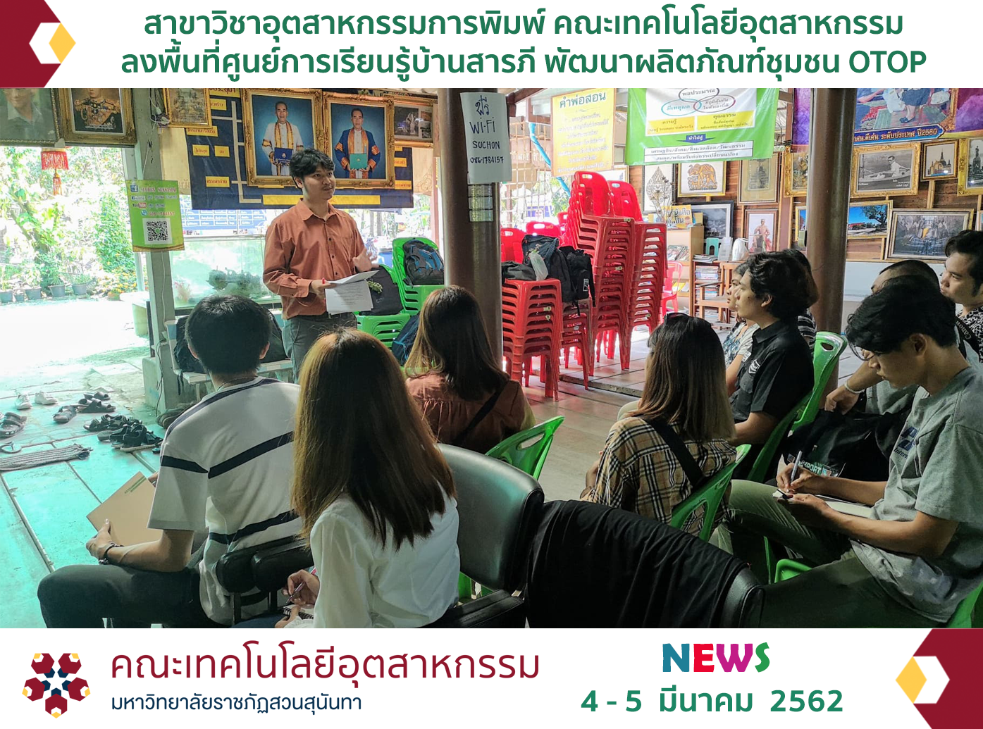 อาจารย์ภาณุพงศ์ จันทน์ผลิน พร้อมด้วยนักศึกษาสาขาวิชาอุตสาหกรรมการพิมพ์ ลงพื้นที่ศูนย์การเรียนรู้เศรษฐกิจพอเพียง บ้านสารภี อำเภอบางคนที จังหวัดสมุทรสงคราม เพื่อดำเนินโครงการ “พัฒนาผลิตภัณฑ์ชุมชน OTOP” ระหว่างวันที่ 4 – 5 มีนาคม 2562 โดยนักศึกษาได้มีส่วนร่วมในการสัมภาษณ์ข้อมูลจากชาวบ้านและถ่ายภาพผลิตภัณฑ์ชุมชน เพื่อนำข้อมูลไปพัฒนาสื่อที่ช่วยยกระดับคุณภาพผลิตภัณฑ์ OTOP ต่อไป