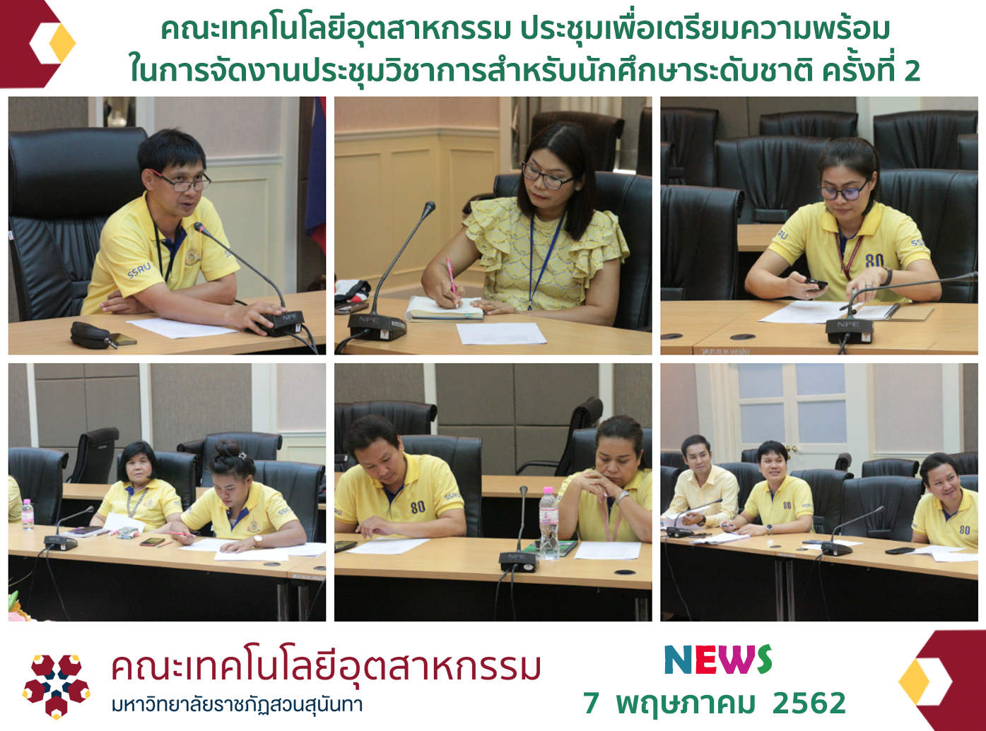 วันที่ 7 พฤษภาคม 2562 ณ ห้องประชุมพิสมัยพิมลสัตย์ คณะเทคโนโลยีอุตสาหกรรม นำโดยอาจารย์ ดร.ชนมภัทร โตระสะ รองคณบดีฝ่ายวิชาการ เป็นประธานการประชุมเพื่อเตรียมความพร้อมในการจัดงานประชุมวิชาการสำหรับนักศึกษาระดับชาติ ครั้งที่ 2 ซึ่งจะจัดขึ้นในวันที่ 7 มิถุนายน 2562 ณ อาคาร 47 คณะเทคโนโลยีอุตสาหกรรม โดยมีบุคลากรสายสนับสนุนคณะเทคโนโลยีอุตสาหกรรม เข้าร่วมประชุมดังกล่าว