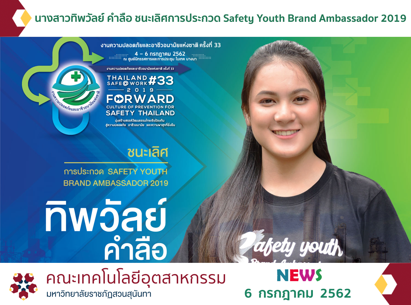 ขอแสดงความยินดีกับนางสาวทิพวัลย์ คำลือ นักศึกษาชั้นปีที่ 3 สาขาวิชาเทคโนโลยีความปลอดภัยและอาชีวอนามัย คณะเทคโนโลยีอุตสาหกรรม ได้รับรางวัลชนะเลิศการประกวด Safety Ambassador Youth 2019 ในงานความปลอดภัยและอาชีวอนามัยแห่งชาติ ครั้งที่ 33 ระหว่างวันที่ 4 - 6 กรกฎาคม 2562 ณ ศูนย์นิทรรศการและการประชุมไบเทค บางนา กรุงเทพมหานคร จัดโดยสถาบันส่งเสริมความปลอดภัย อาชีวอนามัย และสภาพแวดล้อมในการทำงาน (องค์การมหาชน) ทั้งนี้ผู้ที่ได้รับรางวัลจะได้เป็นตัวแทนการประชาสัมพันธ์งานด้านการรณรงค์ส่งเสริมความปลอดภัย อาชีวอนามัย และสภาพแวดล้อมในการทำงานของสถาบันส่งเสริมความปลอดภัยฯ ในอนาคต