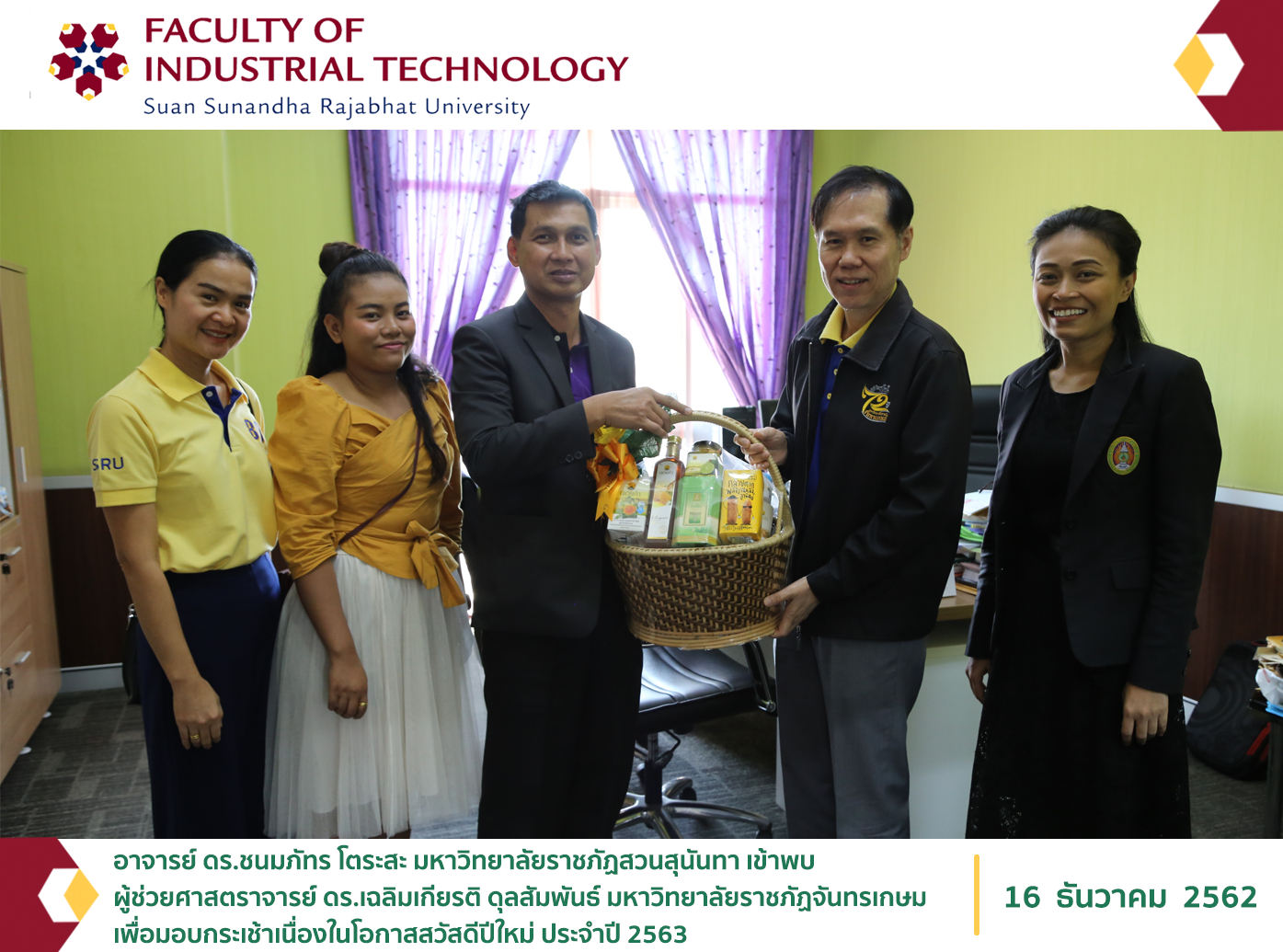 เมื่อวันที่ 16 ธันวาคม 2562 คณะเทคโนโลยีอุตสาหกรรม นำโดย อาจารย์ ดร.ชนมภัทร โตระสะ รองคณบดีฝ่ายวิชาการ พร้อมด้วยบุคลากรกลุ่มงานบริการการศึกษา เข้าพบผู้ช่วยศาสตราจารย์ ดร.เฉลิมเกียรติ ดุลสัมพันธ์ รองอธิการบดีฝ่ายประกันคุณภาพการศึกษาและบริการวิชาการ มหาวิทยาลัยราชภัฏจันทรเกษม และดำรงตำแหน่งประธานคณะกรรมการประกันคุณภาพการศึกษาภายในมหาวิทยาลัยราชภัฏ เพื่อมอบกระเช้าเนื่องในโอกาสสวัสดีปีใหม่ ประจำปี 2563 ณ มหาวิทยาลัยราชภัฏจันทรเกษม