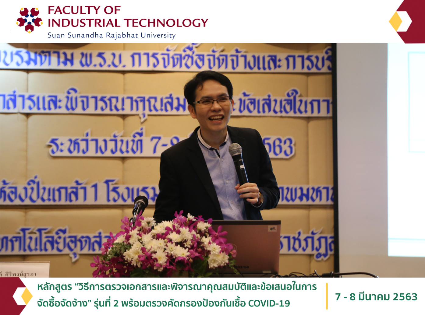 คณะเทคโนโลยีอุตสาหกรรม มหาวิทยาลัยราชภัฏสวนสุนันทา จัดการฝึกอบรมตาม พ.ร.บ. การจัดซื้อจัดจ้างและการบริหารพัสดุภาครัฐ พ.ศ. 2560 หลักสูตร “วิธีการตรวจเอกสารและพิจารณาคุณสมบัติและข้อเสนอในการจัดซื้อจัดจ้าง” รุ่นที่ 2 ระหว่างวันที่ 7 - 8 มีนาคม 2563 ณ โรงแรม รอยัลซิตี้ กรุงเทพฯ โดยมี อาจารย์ ดร.ชนมภัทร โตระสะ รองคณบดีฝ่ายวิชาการ คณะเทคโนโลยีอุตสาหกรรม เป็นประธานกล่าวเปิดการอบรม