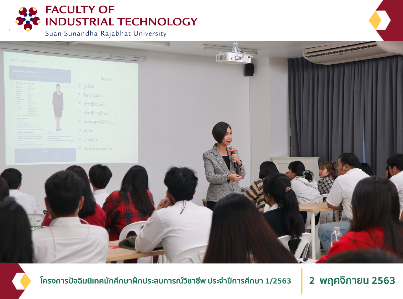เมื่อวันที่ 2 พฤศจิกายน 2563 ฝ่ายบริการการศึกษา และ ฝ่ายกิจการนักศึกษาและศิลปวัฒนธรรม คณะเทคโนโลยีอุตสาหกรรม จัดโครงการปัจฉิมนิเทศนักศึกษาฝึกประสบการณ์วิชาชีพ ประจำปีการศึกษา 1/2563 โดยมี ผู้ช่วยศาสตราจารย์ ดร.ชนมภัทร โตระสะ รองคณบดีฝ่ายวิชาการ เป็นประธานกล่าวเปิดโครงการ ทั้งนี้ได้รับเกียรติจาก อาจารย์นฤมล ชมโฉม บรรยายในหัวข้อ “เคล็ดลับพัฒนาบุคลิกภาพพิชิตนายจ้าง” และวิทยากรจากบริษัท ซูเปอร์ เรซูเม่ จำกัด โดยคุณทฤฆชนม์ สิริทวีชัย บรรยายในหัวข้อ “การศึกษาต่อและการประกอบอาชีพ การสมัครงาน การเขียน Resumeให้โดนใจนายจ้าง” ณ ห้อง 4711 อาคาร 47 คณะเทคโนโลยีอุตสาหกรรม