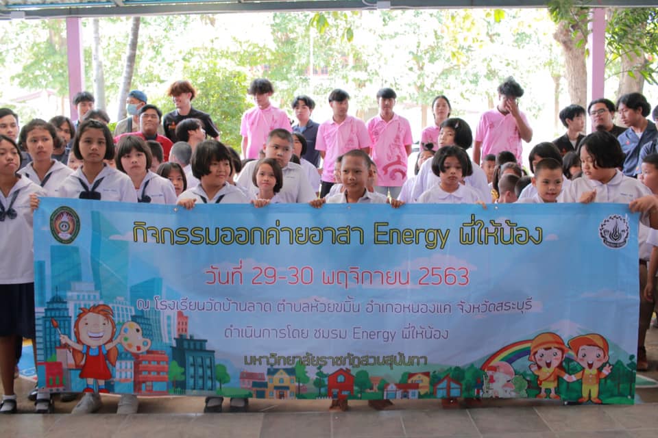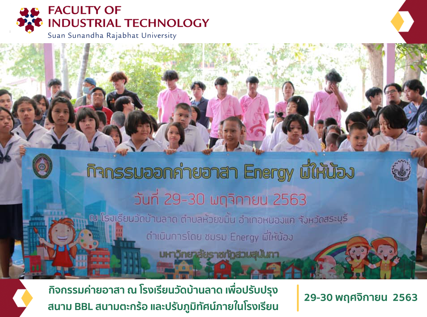 เมื่อวันที่ 29 – 30 พฤศจิกายน 2563 โรงเรียนวัดบ้านลาด ร่วมกับ ชมรม Energy พี่ให้น้อง ของสาขาวิชาเทคโนโลยีไฟฟ้า คณะเทคโนโลยีอุตสาหกรรม มหาวิทยาลัยราชภัฏสวนสุนันทา นำโดย รองคณบดีฝ่ายวิชาการ ผศ.ดร.ชนมภัทร โตระสะ รองคณบดีฝ่ายวิชาการ, ผศ.ดร.อธิสมัย โสพันธ์, อาจารย์ณัฐิดา จันหอม จัดกิจกรรมค่ายอาสา ณ โรงเรียนวัดบ้านลาด เพื่อปรับปรุงสนาม BBL สนามตะกร้อ และปรับภูมิทัศน์ภายในโรงเรียน โดยนายวิชัย พรหมบุตร ผู้อำนวยการโรงเรียนวัดบ้านลาด ได้กล่าวขอบคุณคณาจารย์และนักศึกษาที่มีจิตอาสา เสียสละเวลาในการสร้างแหล่งเรียนรู้ให้กับทางโรงเรียนจนแล้วเสร็จ ซึ่งทางโรงเรียนจะได้ใช้ในการจัดการเรียนการสอนแก่นักเรียนต่อไป