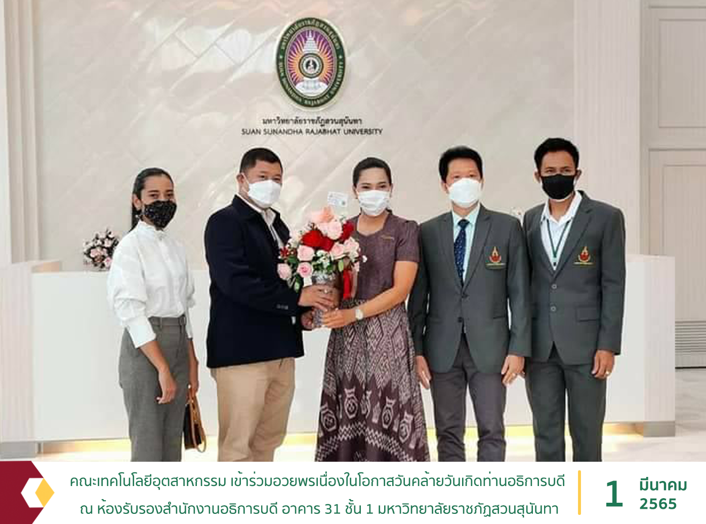 เมื่อวันที่ 1 มีนาคม 2565 คณะเทคโนโลยีอุตสาหกรรม นำโดย คณบดี  ผู้ช่วยศาสตราจารย์ ดร.สุรพันธุ์ รัตนาวะดี พร้อมด้วยคณาจารย์ เข้าร่วมอวยพรเนื่องในโอกาสวันคล้ายวันเกิดท่านอธิการบดี แด่รองศาสตราจารย์ ดร.ชุติกาญจน์ ศรีวิบูลย์ ณ ห้องรับรองสำนักงานอธิการบดี อาคาร 31 ชั้น 1 มหาวิทยาลัยราชภัฏสวนสุนันทา