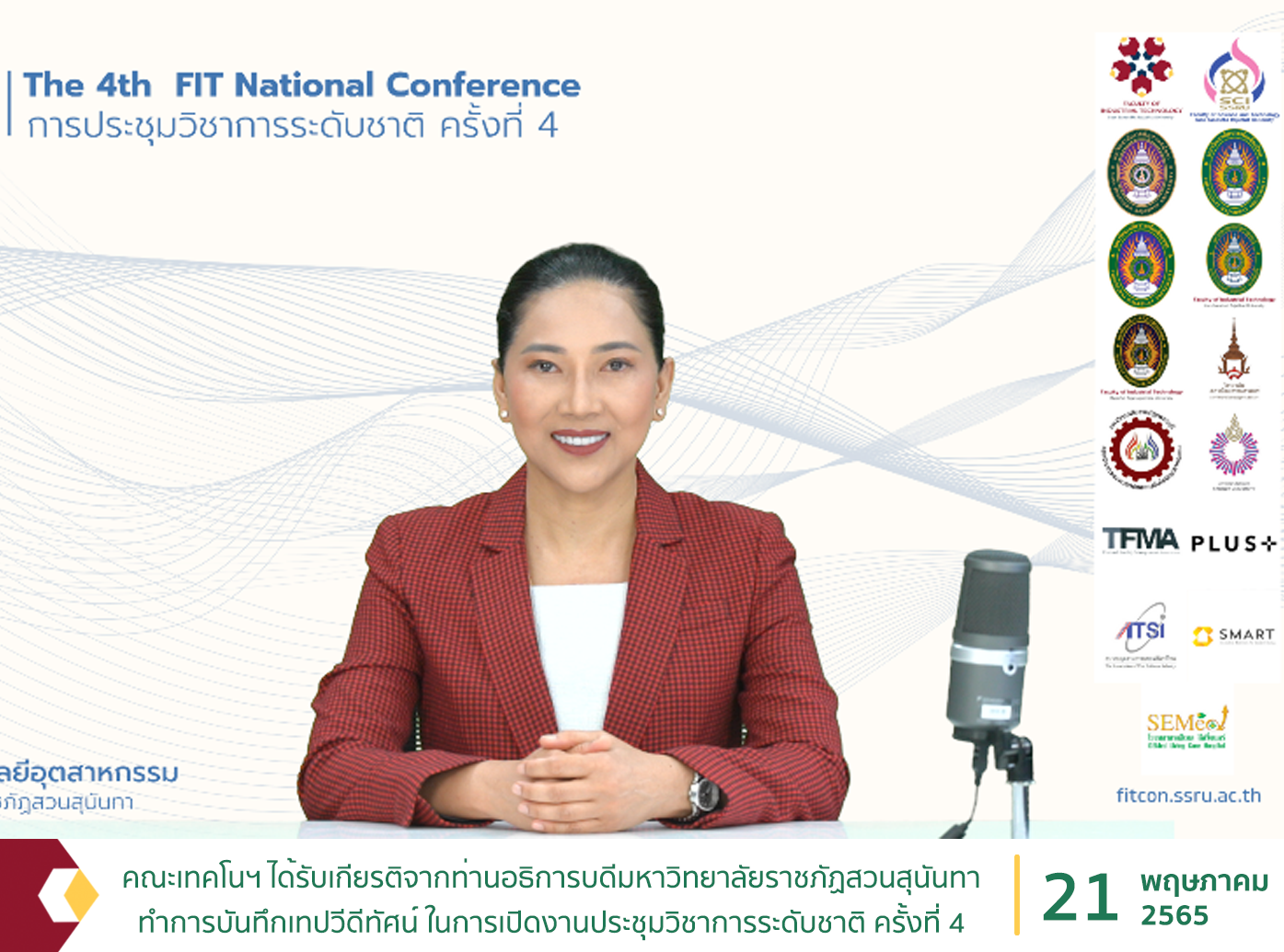 คณะเทคโนโลยีอุตสาหกรรมได้รับเกียรติจากท่านอธิการบดีมหาวิทยาลัยราชภัฏสวนสุนันทา รองศาสตราจารย์ ดร.ชุติกาญจน์ ศรีวิบูลย์ ทำการบันทึกเทปวีดีทัศน์ (VDO) ในการเปิดงานประชุมวิชาการระดับชาติ ครั้งที่ 4 ให้แก่นักวิจัยจากสถาบันการศึกษาหน่วยงานภาครัฐ และภาคเอกชน รวมทั้งนักศึกษาคณะเทคโนโลยีอุตสาหกรรม ในวันศุกร์ที่ 20 พฤษภาคม พ.ศ. 2565 โดยจะมีการจัดการประชุมในวันที่ 27 พฤษภาคม พ.ศ. 2565 เวลา 09.00 น. ผ่านระบบออนไลน์ Google Meet