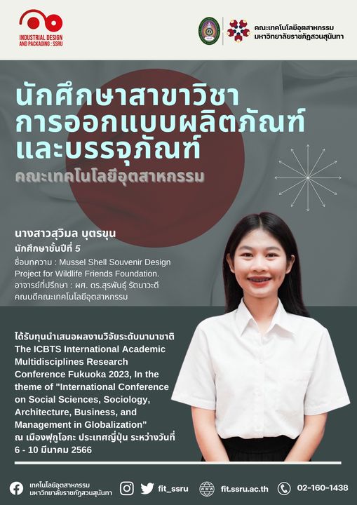 นางสาวสุวิมล บุตรขุน นักศึกษาสาขาวิชาการออกแบบผลิตภัณฑ์และบรรจุภัณฑ์ คณะเทคโนโลยีอุตสาหกรรม ได้รับทุนนำเสนอผลงานวิจัยระดับนานาชาติ The ICBTS International Academic Multidisciplines Research Conference Fukuoka 2023, In the theme of "International Conference on Social Sciences, Sociology, Architecture, Business, and Management in Globalization"