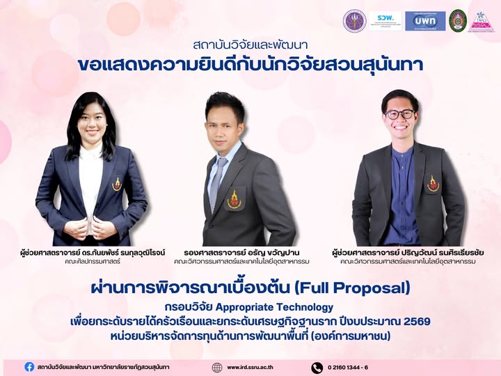 คณะวิศวกรรมศาสตร์และเทคโนโลยีอุตสาหกรรม ขอแสดงความยินดีกับ รองศาสตราจารย์ อรัญ ขวัญปาน และผู้ช่วยศาสตราจารย์ ปริญวัฒน์ ธนศิรเธียรชัย ในโอกาสผ่านการพิจารณาเบื้องต้น ข้อเสนอชุดโครงการวิจัยฉบับสมบูรณ์ (Full Proposal) ภายใต้กรอบการวิจัย“การขยายผลวิจัยเทคโนโลยีที่เหมาะสม (Appropriate Technology) เพื่อยกระดับรายได้ครัวเรือนและยกระดับเศรษฐกิจฐานราก” ประจำปีงบประมาณ 2569 โดย หน่วยบริหารจัดการทุนด้านการพัฒนาพื้นที่ (องค์การมหาชน)