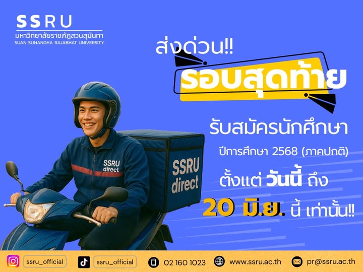 "SSRU Direct" รับตรง รอบที่ 5 รอบสุดท้ายหมดเขต 20 มิ.ย. 2568 นี้ สมัครเลยที่ https://ssru.ac.th/admission/