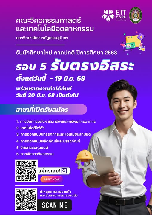 คณะวิศวกรรมศาสตร์และเทคโนโลยีอุตสาหกรรม มหาวิทยาลัยราชภัฏสวนสุนันทา เปิดรับสมัครนักศึกษาใหม่ปีการศึกษา 2568 รอบ 5 รับตรงอิสระ ตั้งแต่วันนี้ – 19 มิถุนายน 2568 รายละเอียดเพิ่มเติม โทร 021601438 ต่อ 14-26