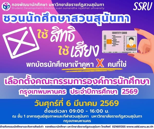 ชวนนักศึกษาสวนสุนันทา ใช้สิทธิเลือกตั้งคณะกรรมการองค์การนักศึกษาประจำปีการศึกษา 2569 วันที่ 6 มีนาคม 2569 ณ ชั้น 1 อาคารศูนย์สุขภาพและกีฬาสวนสุนันทา เวลา 09.00 - 16.00 น.
