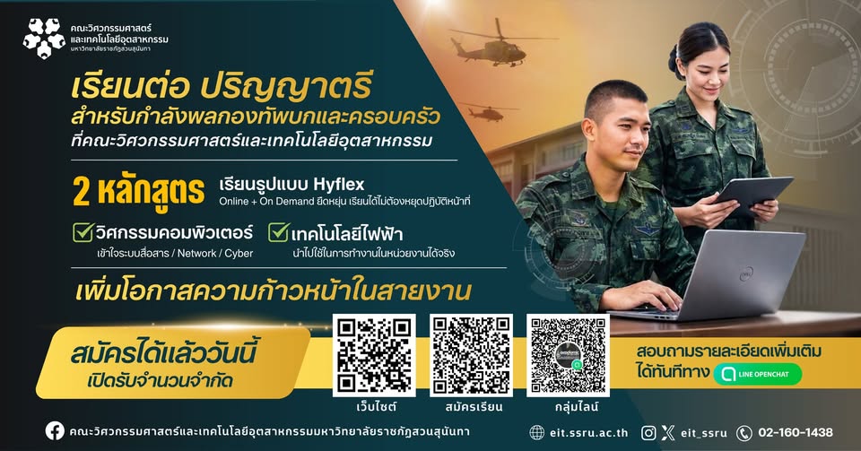 เพิ่มความก้าวหน้าในสายงาน สำหรับกำลังพลกองทัพบกและครอบครัว คณะวิศวกรรมศาสตร์และเทคโนโลยีอุตสาหกรรม เปิดรับสมัครนักศึกษาใหม่ปีการศึกษา 2569 ภาคเรียนที่ 1 กับสองหลักสูตร