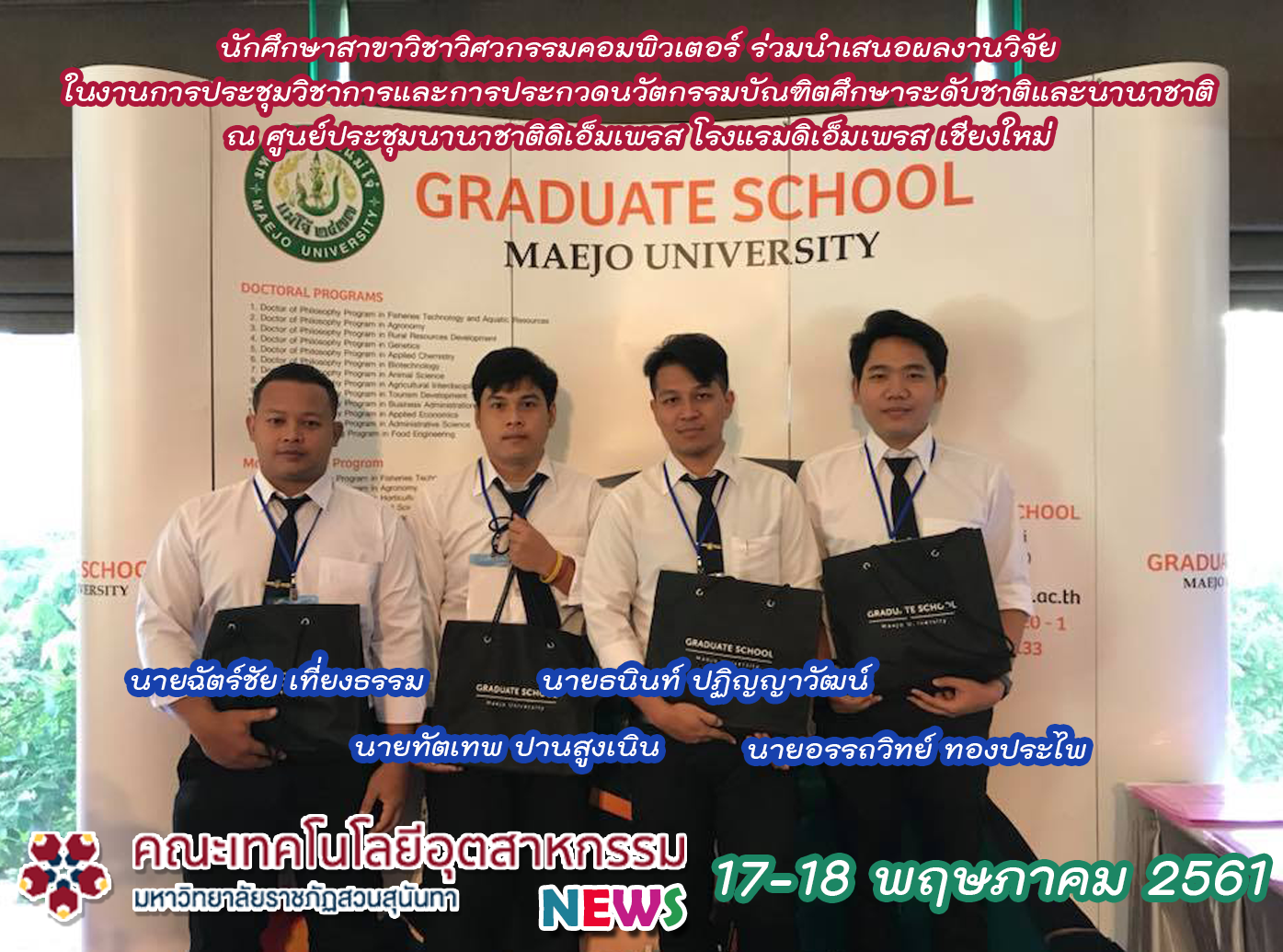 นักศึกษาสาขาวิชาวิศวกรรมคอมพิวเตอร์ ร่วมนำเสนอผลงานวิจัย ในงานการประชุมวิชาการและการประกวดนวัตกรรมบัณฑิตศึกษาระดับชาติและนานาชาติ ณ ศูนย์ประชุมนานาชาติดิเอ็มเพรส โรงแรมดิเอ็มเพรส เชียงใหม่