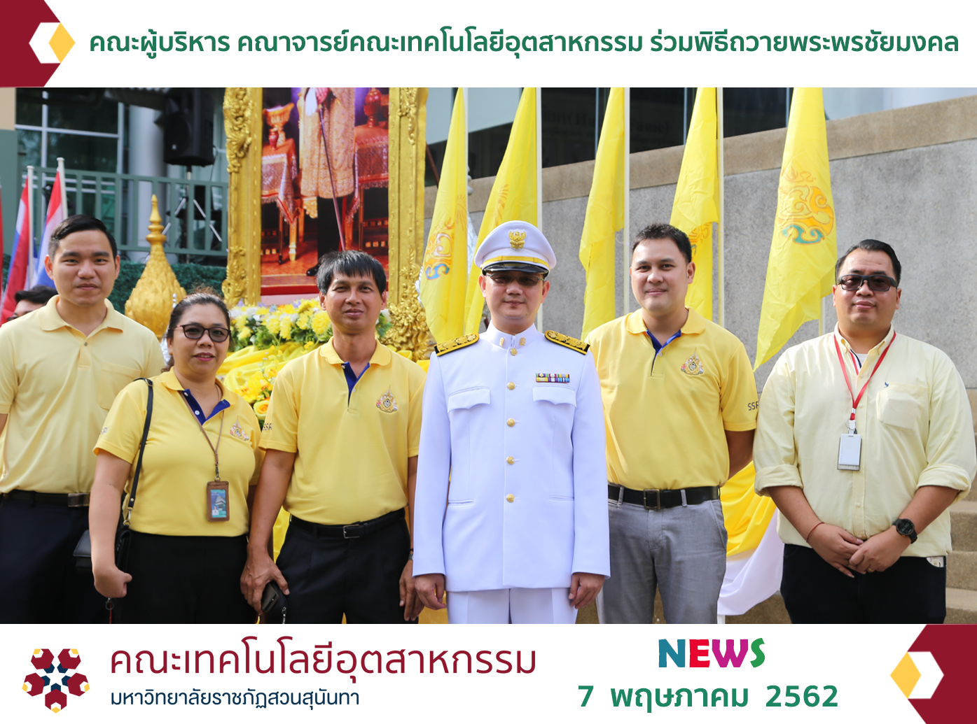 วันที่ 7 พฤษภาคม 2562 เวลา 08.00 น. ผู้บริหารและคณาจารย์คณะเทคโนโลยีอุตสาหกรรม นำโดย ผู้ช่วยศาสตราจารย์ ดร.พลัง วงษ์ธนสุภรณ์ คณบดีคณะเทคโนโลยีอุตสาหกรรม ร่วมพิธีถวายพระพรชัยมงคล พระบาทสมเด็จพระปรเมนทรรามาธิบดีศรีสินทร มหาวชิราลงกรณ พระวชิรเกล้าเจ้าอยู่หัว เนื่องในโอกาสมหามงคลพระราชพิธีบรมราชาภิเษก ณ บริเวณพิธีหน้าอาคารสำนักงานอธิการบดี
